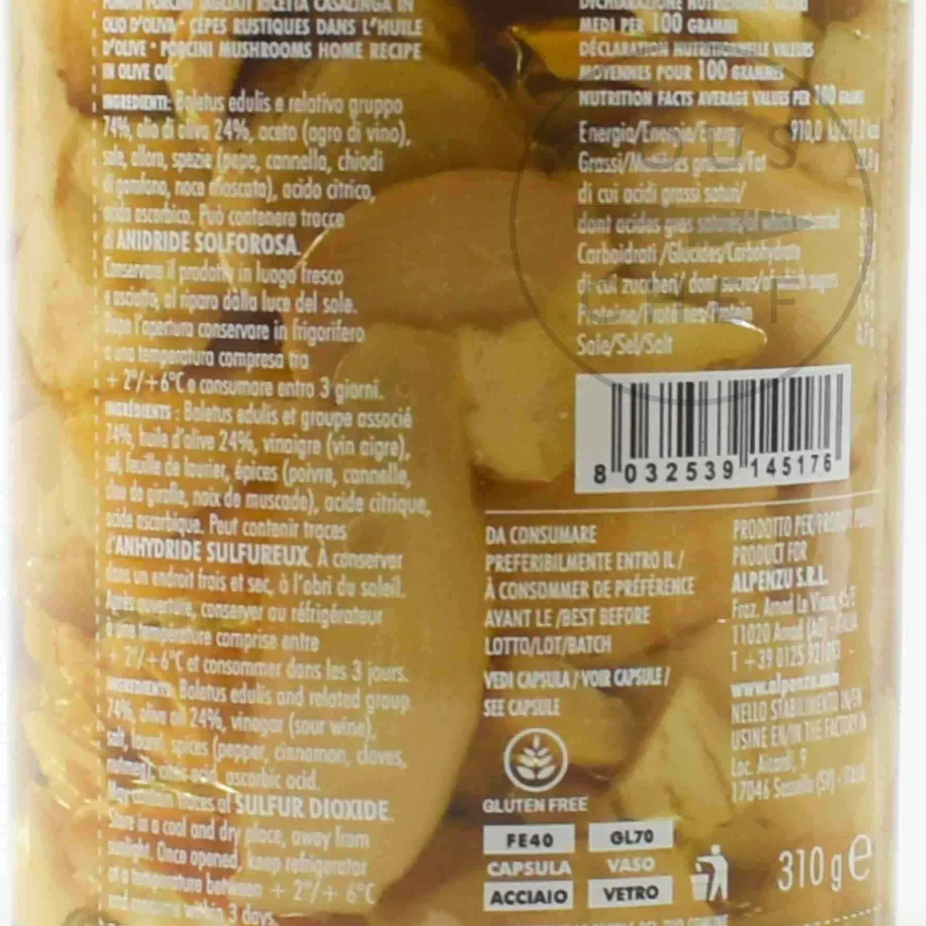 Product formulations and details may change. For the latest ingredients and allergen information always check product packaging prior to consumption. Ingredients: Boletus edulis and related group 74%, olive oil 24%, vinegar (sour wine), salt, laurel, spices (pepper, cinnamon, cloves, nutmeg), citric acid, ascorbic acid.