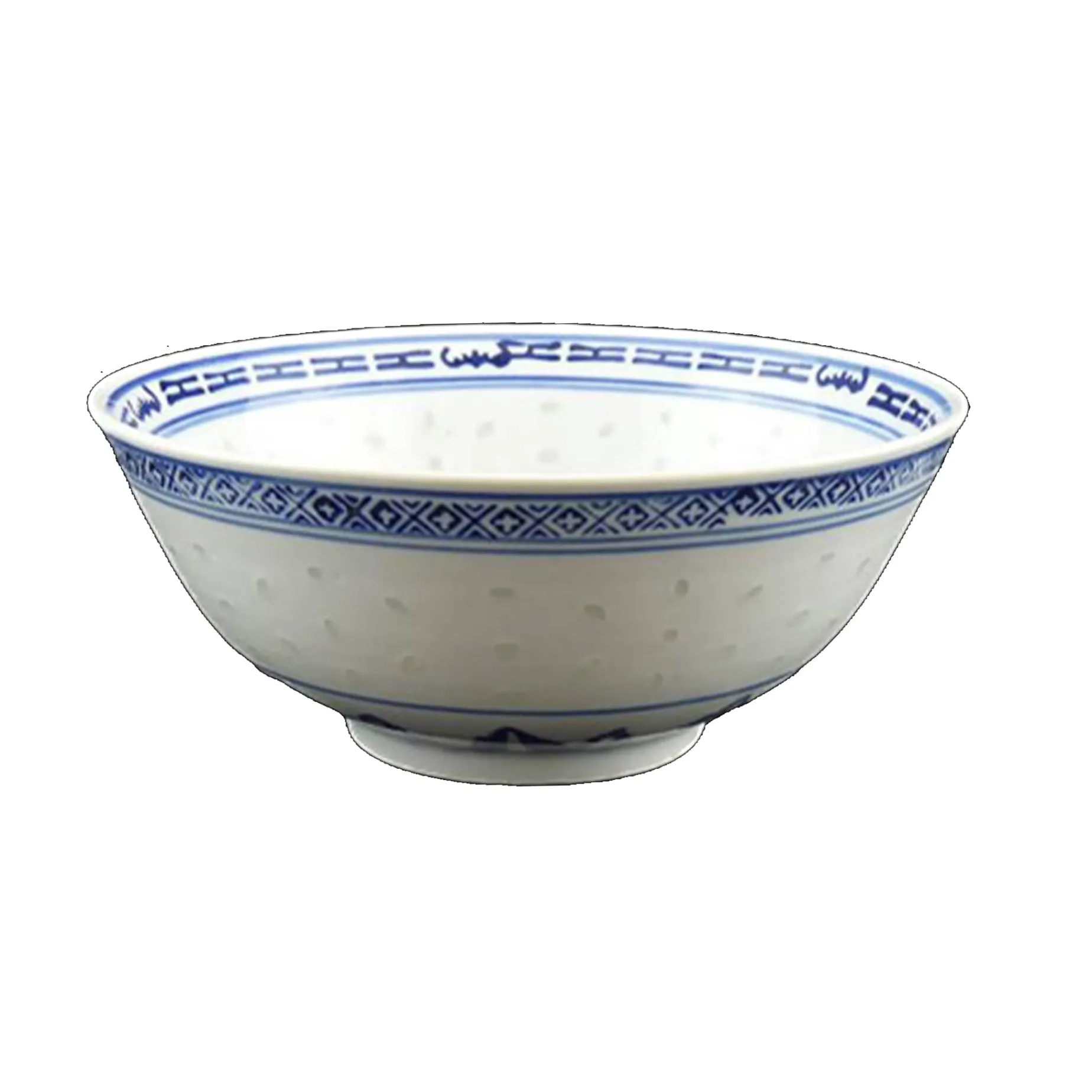 The bowl has a decorative border and translucent ‘rice grain’ pattern. There is a traditional Chinese design at the bottom of the bowl which is revealed while you eat.