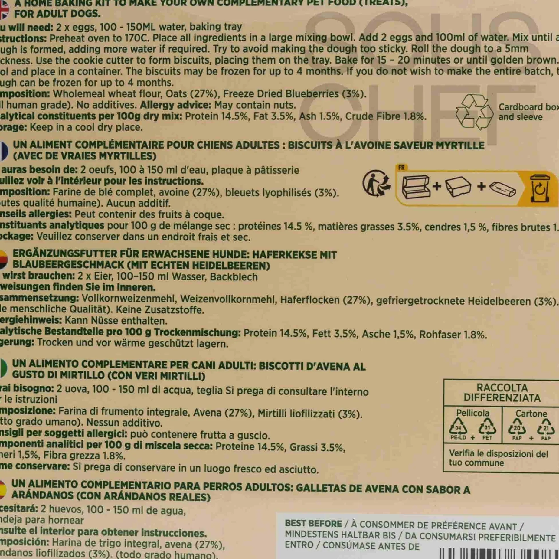 Ingredients: Wholemeal wheat flour, oats (27%) freeze dried blueberries (3%).