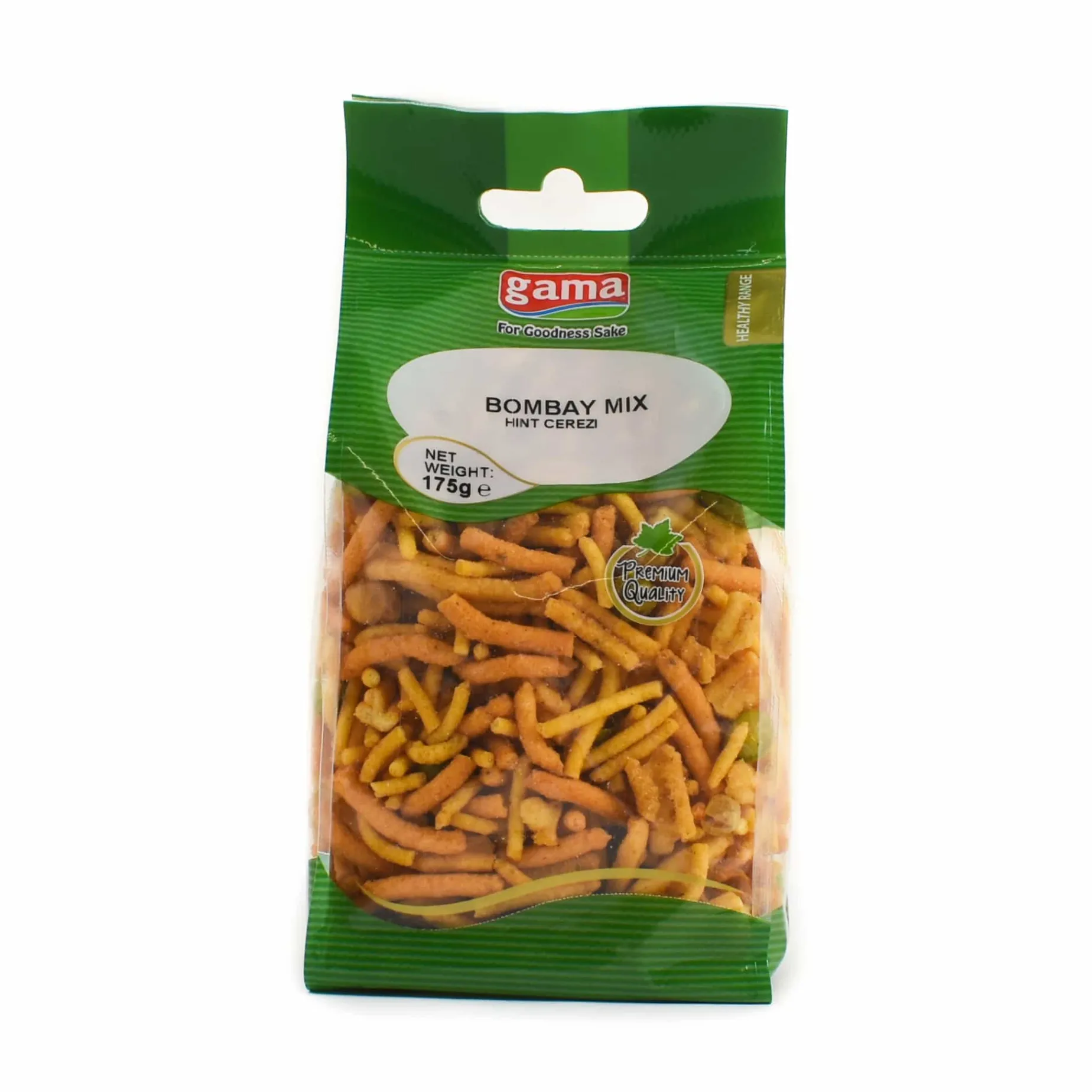 This Bombay mix contains crispy gram flour noodles, chickpeas, peanuts and fried lentils. These are seasoned with traditional spices like chilli and caraway seeds.
