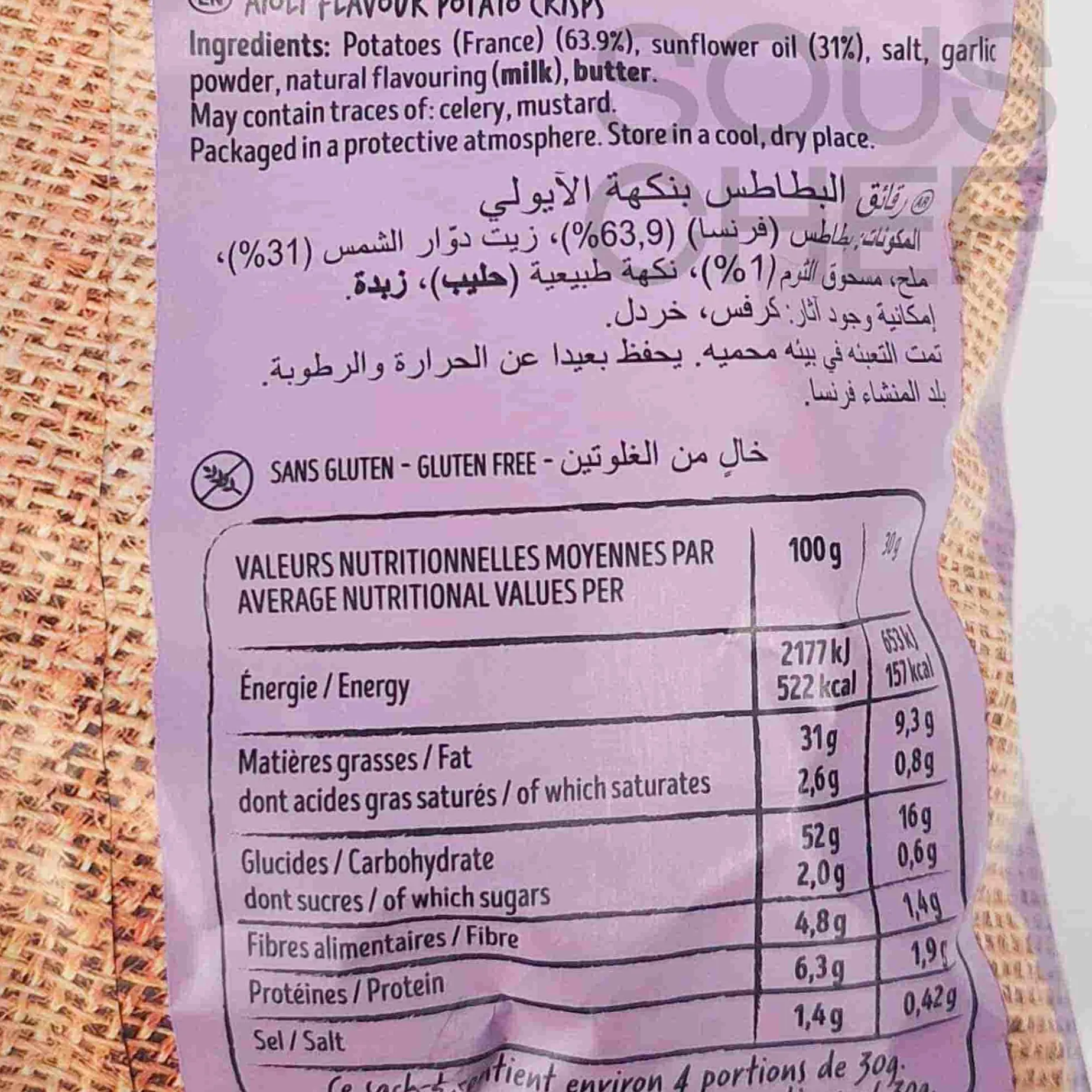 Product formulations and details may change. For the latest ingredients and allergen information always check product packaging prior to consumption. Ingredients: Potatoes (France), sunflower oil, salt, garlic powder, natural flavouring (milk), butter.