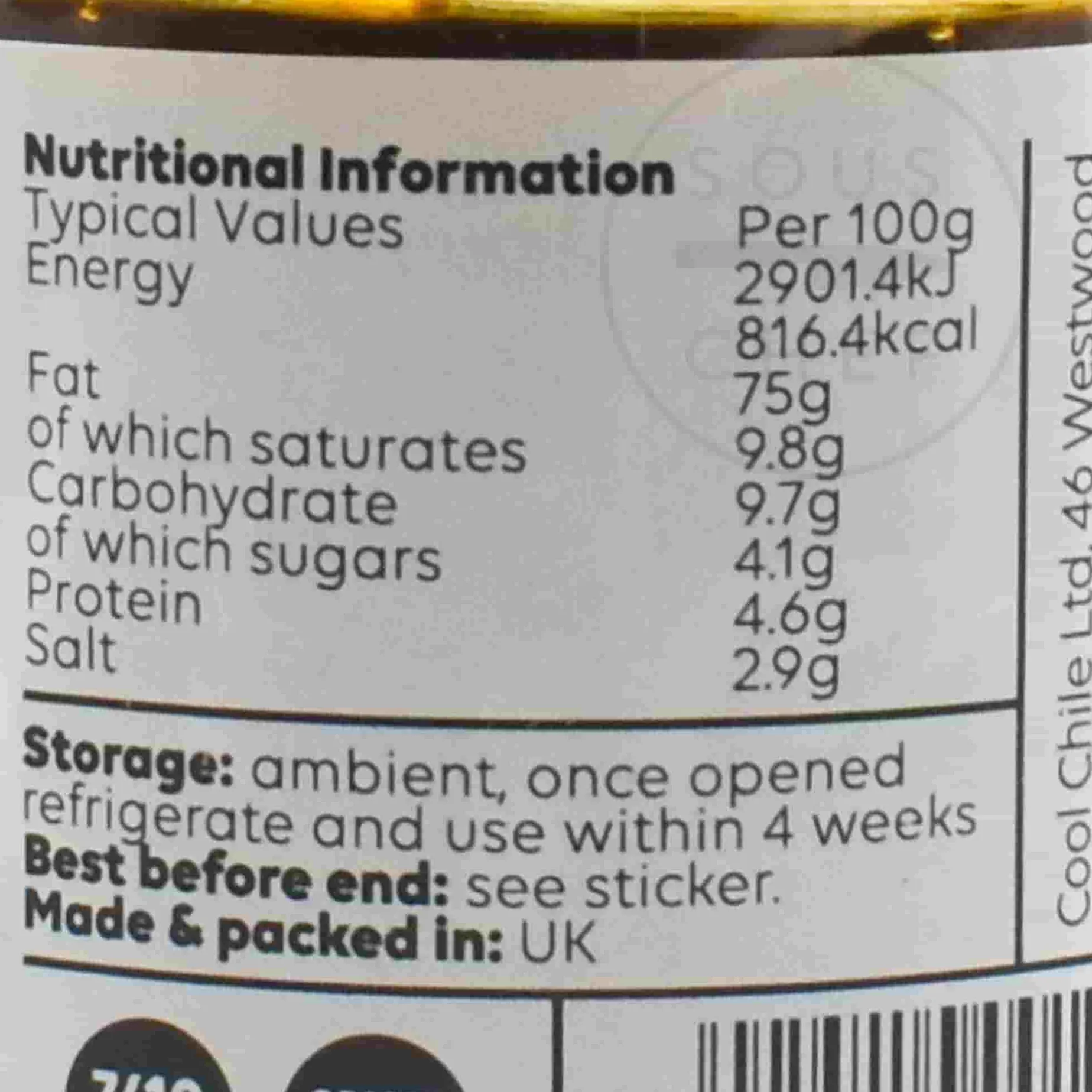 Product formulations and details may change. For the latest ingredients and allergen information always check product packaging prior to consumption. Ingredients: Sunflower oil, extra virgin olive oil (28%), mexican dried chillies (15.2%) [arbol seeds, arbol, guajillo, pasilla de oaxaca, chipotle], cider vinegar, peanuts (4.7%), garlic (4.1%), almonds, pumpkin seeds, sea salt, sesame seeds, mexican oregano.