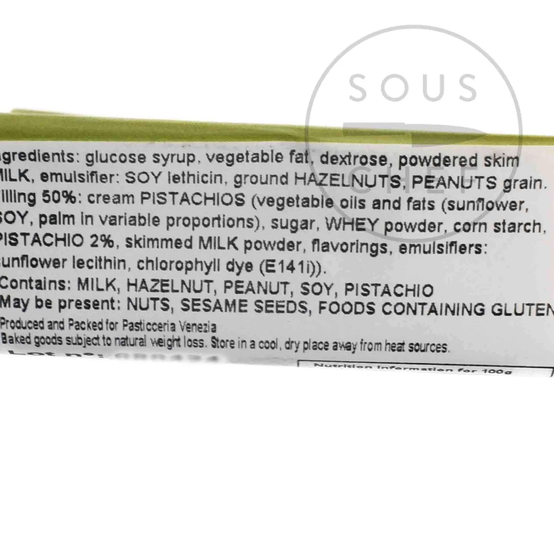Product formulations and details may change. For the latest ingredients and allergen information always check product packaging prior to consumption. Ingredients: Glucose syrup, vegetable fat, dextrose, powdered skim milk, emulsifier: soy lethicin, ground hazelnuts, peanuts grain. filling 50%: cream pistachios (vegetable oils and fats (sunflower, soy, palm in variable proportion), sugar, whey powder, corn starch, pistachios (2%), skimmed milk powder, emulsifiers: sunflower lecithins, chlorophyll dye (e141), flavourings).