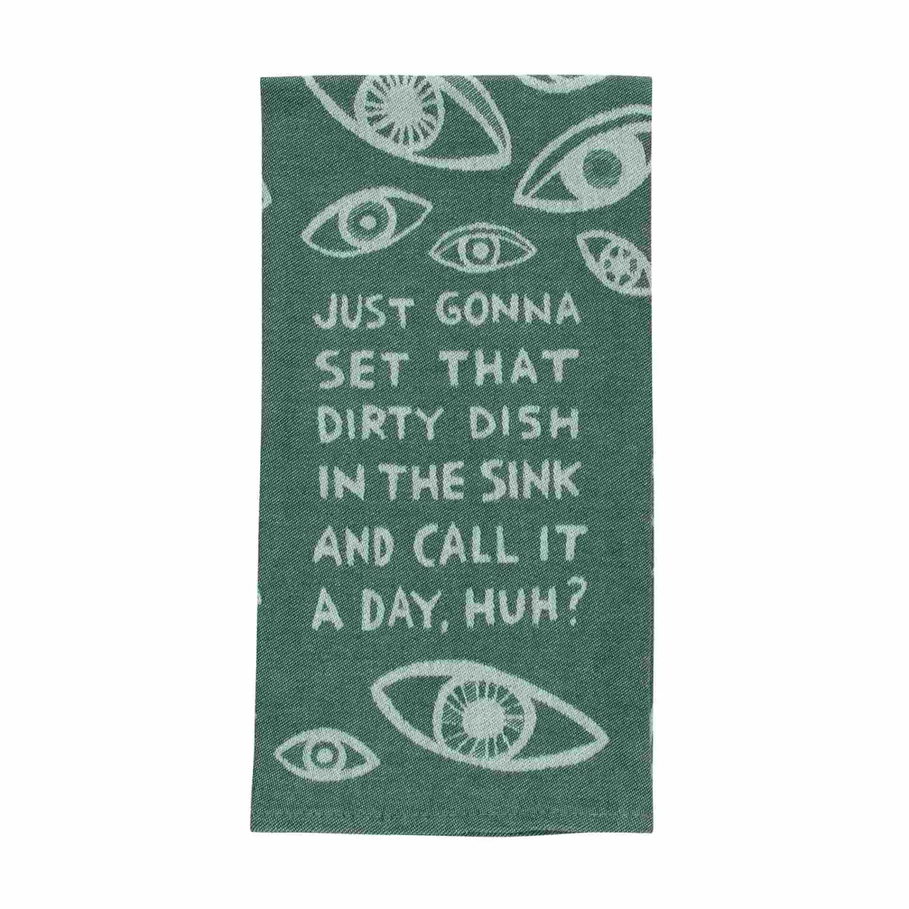 The deep green towel features a slogan that reads: ‘Just gonna set that dirty dish in the sink and call it a day, huh?’. It’s a tongue-in-cheek message that’s perfect for idle siblings and flatmates. The pale green eyes let them know you’re watching! Since the towel is jacquard, the art is woven right into the fabric, rather than screen printed.