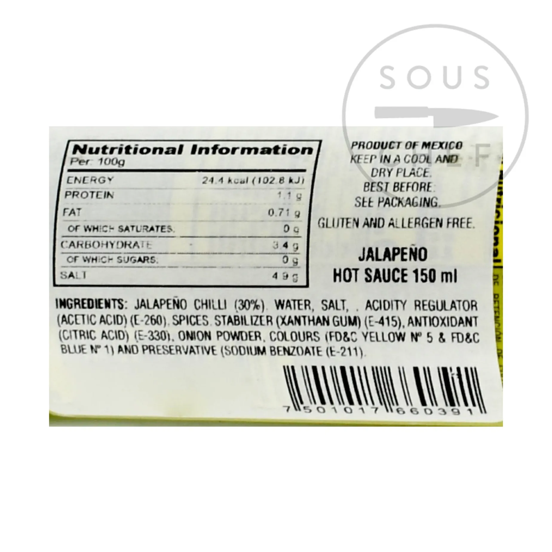 Product formulations and details may change. For the latest ingredients and allergen information always check product packaging prior to consumption. Ingredients: Green jalapeño peppers (30%), water, salt, acetic acid E360, spices, xanthan gum E415, citric acid E330, onion powder, yellow and blue colourings, sodium benzoate E211.
