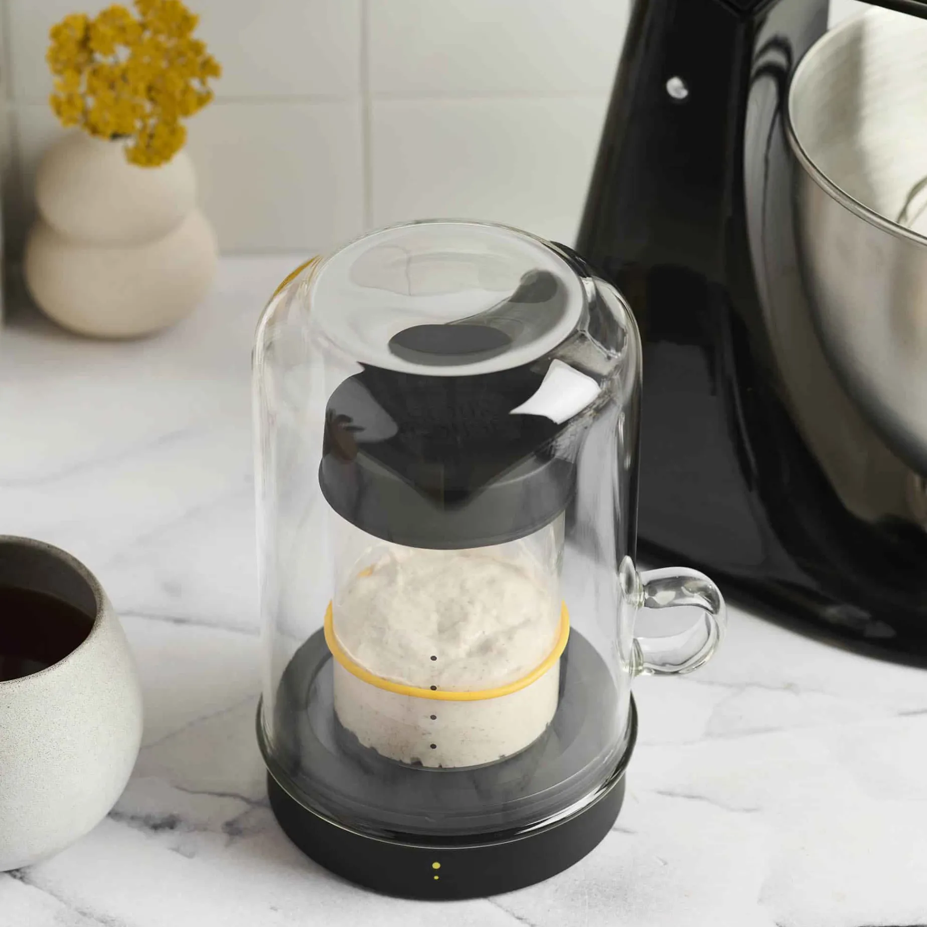 Using Goldie couldn’t be easier. Simply place your sourdough starter jar on the warming base under the cloche.