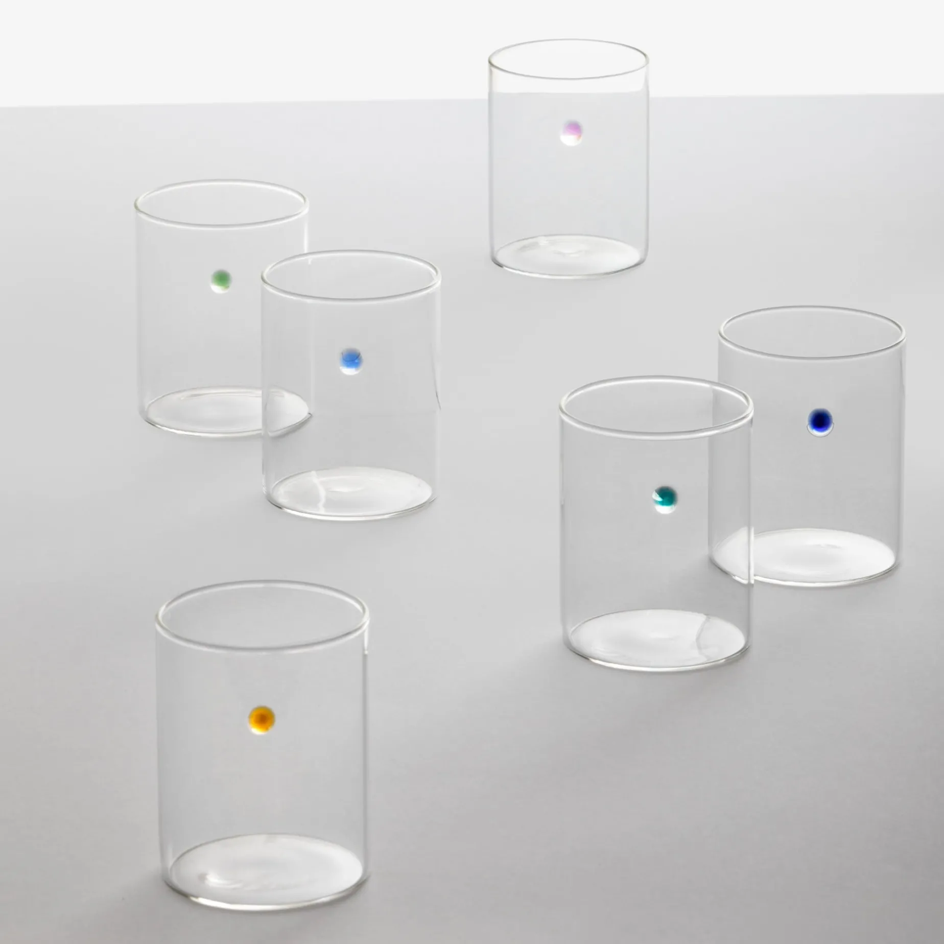 This set of 6 of Ichendorf Milano is a stunning glassware collection to serve water or wine in style. Each cylinder-shaped tumbler has a different coloured glass bead detail. Each of the 6 glasses features a unique iridescent colour, including amber, lilac and blue shades. These simple tumblers hold drinks in elegant style.