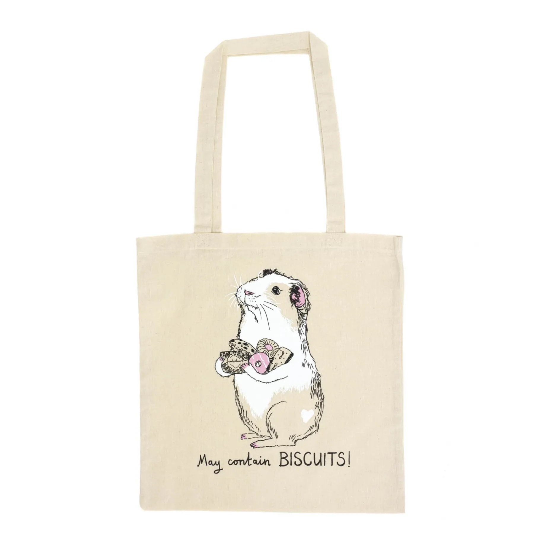Use the may contain biscuits guinea pig tote bag to carry your weekly food shop. This simple cotton tote has a long double strap, letting you carry it over your shoulder or in your hands. An adorable black and white guinea pig illustration adds a colourful contrast to the cream bag. Become the envy of everyone at the checkouts with this bag – fill it with fruit, vegetables and biscuits!