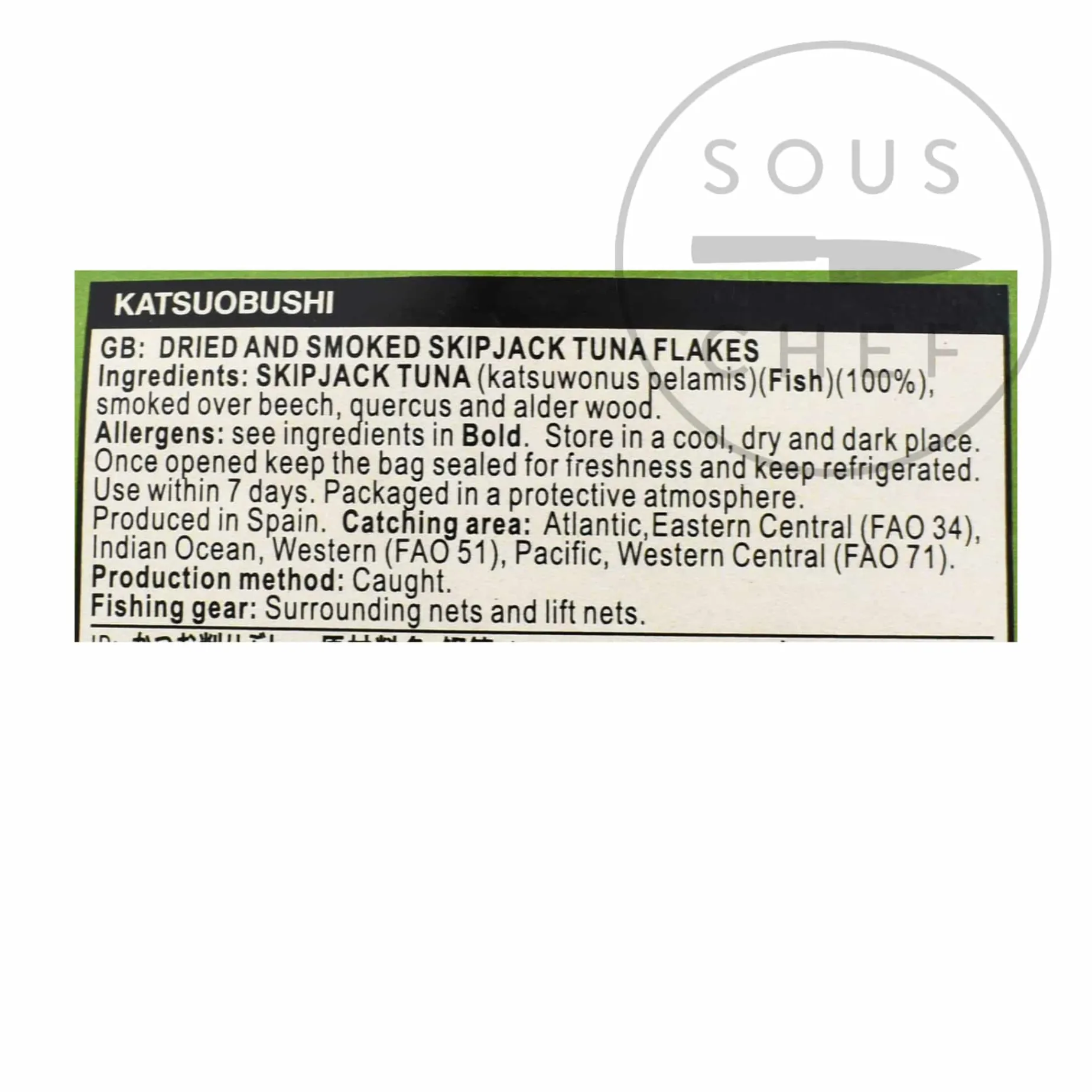 Katsuo Bushi bonito flakes, or katsuobushi, are tissue-paper thin fish shavings with intense umami flavours. They come from a tuna-like Pacific fish which is dried, fermented to wood-like hardness and then smoked. Use along with dried kelp to form the base of the Japanese stock dashi.