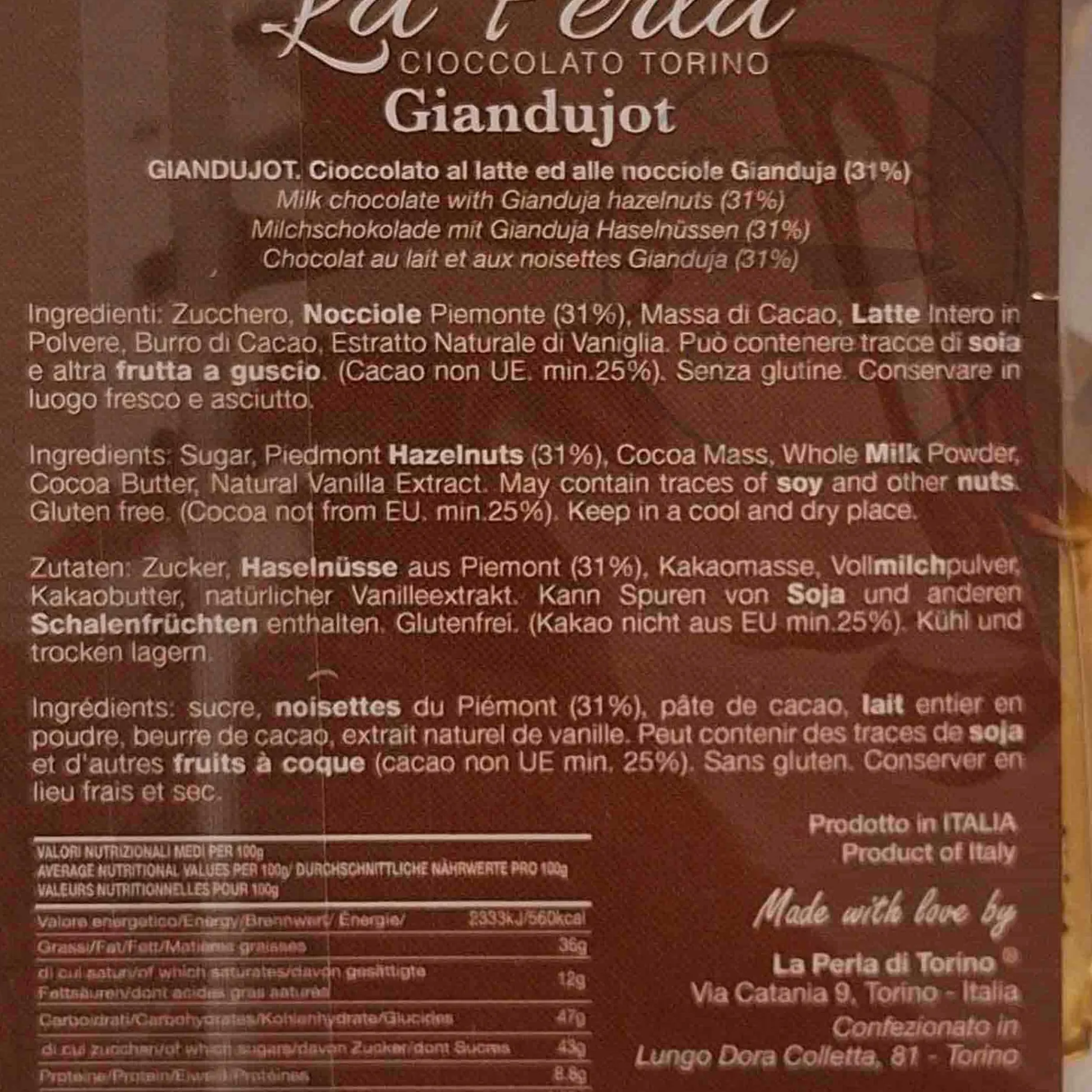 Company founder Sergio Arzilli grew up in his family’s pastry business. But when he discovered he was coeliac, he decided to turn this limitation into an opportunity. He studied the art of chocolate making, and in 1992, founded La Perla di Torino. The company specialises in gluten-free offerings, made in Turin, the spiritual home of gianduja, using the best-quality ingredients, including the Piedmont Tonda Gentile Trilobata Hazelnut.