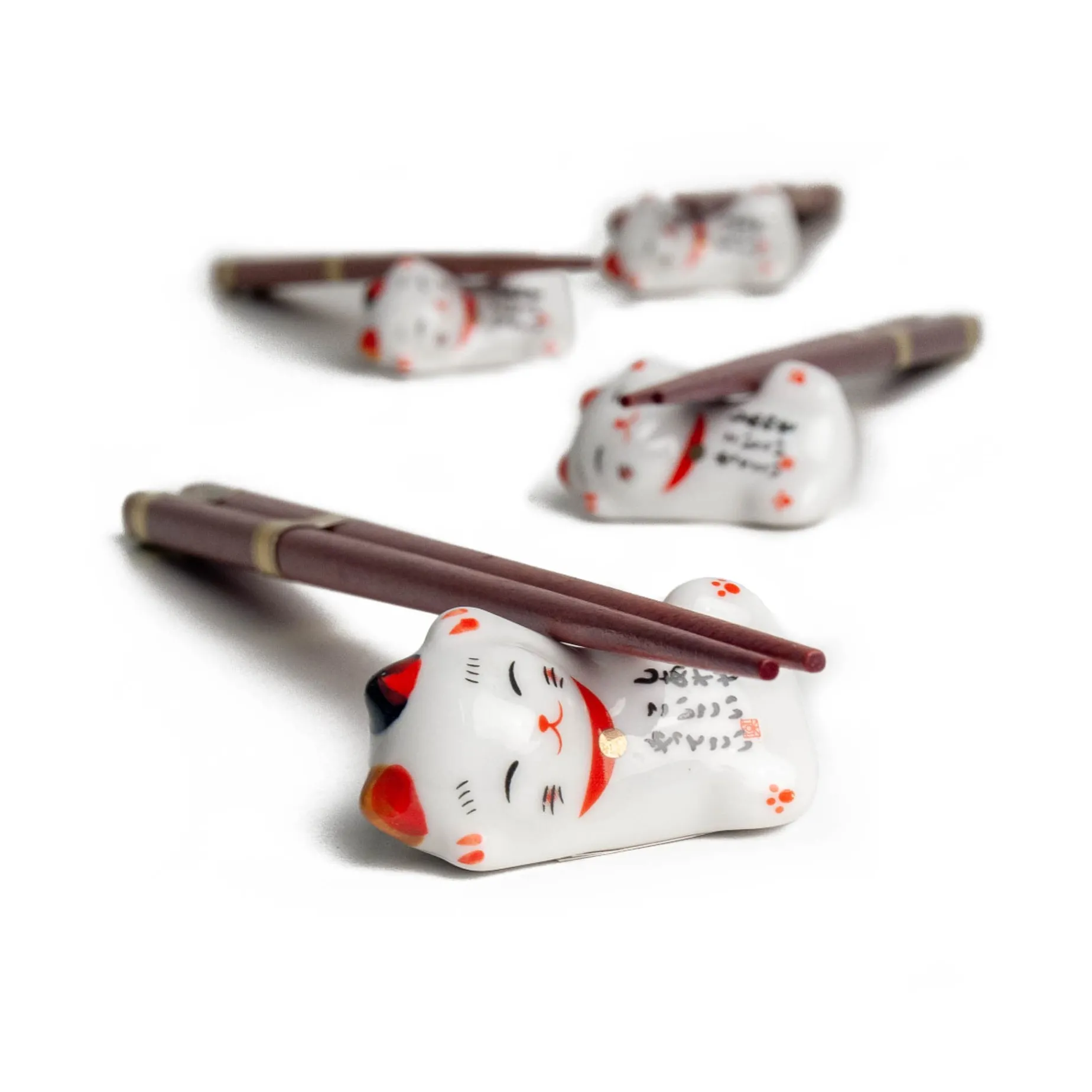 When you need a break from your Japanese feast, simply rest the bamboo chopsticks gently on the sleeping cat’s neck. Each chopstick rest is hand-decorated with beautiful intricate detail.