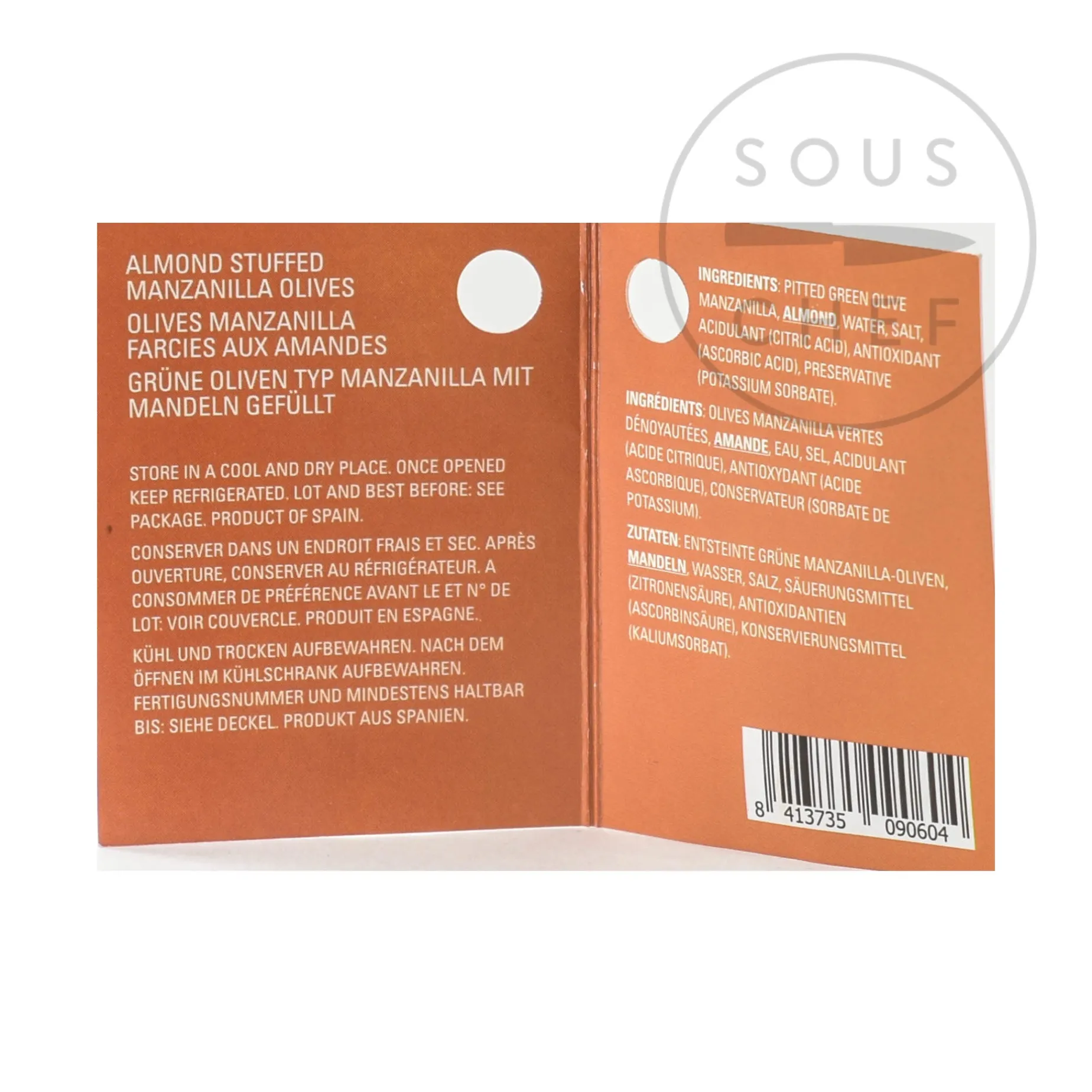 Product formulations and details may change. For the latest ingredients and allergen information always check product packaging prior to consumption. Ingredients: Pitted green olive manzanilla (31%), almond (20%), salt, acidulant (E330),preservative (E202), flavour enhancer (E621), antioxidant (E300).