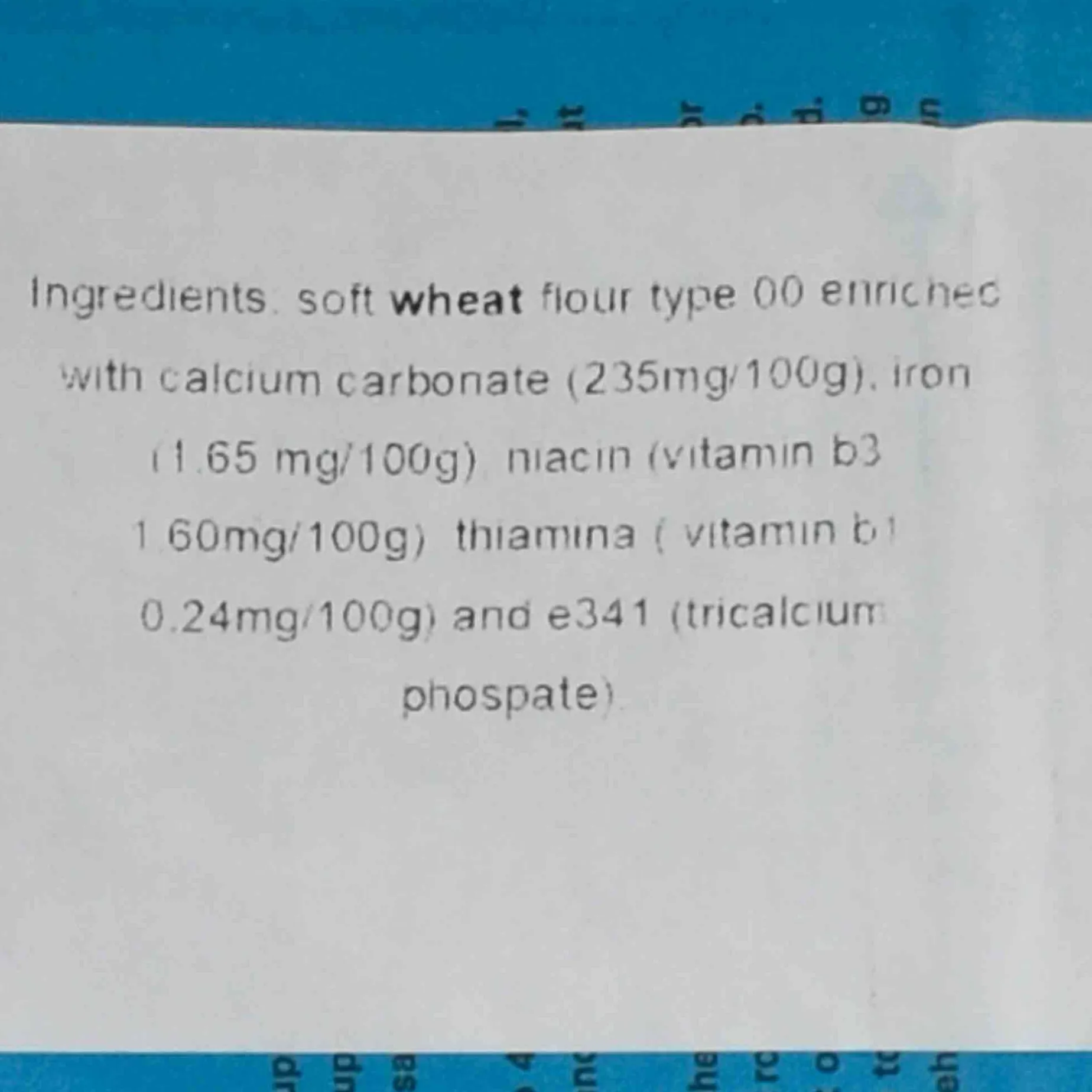 Product formulations and details may change. For the latest ingredients and allergen information always check product packaging prior to consumption. Ingredients: Soft wheat flour type “00” enriched with calcium carbonate, iron, niacin (vitamin b3), thiamine (vitamin b1) and e341 (tricalcium phosphate).