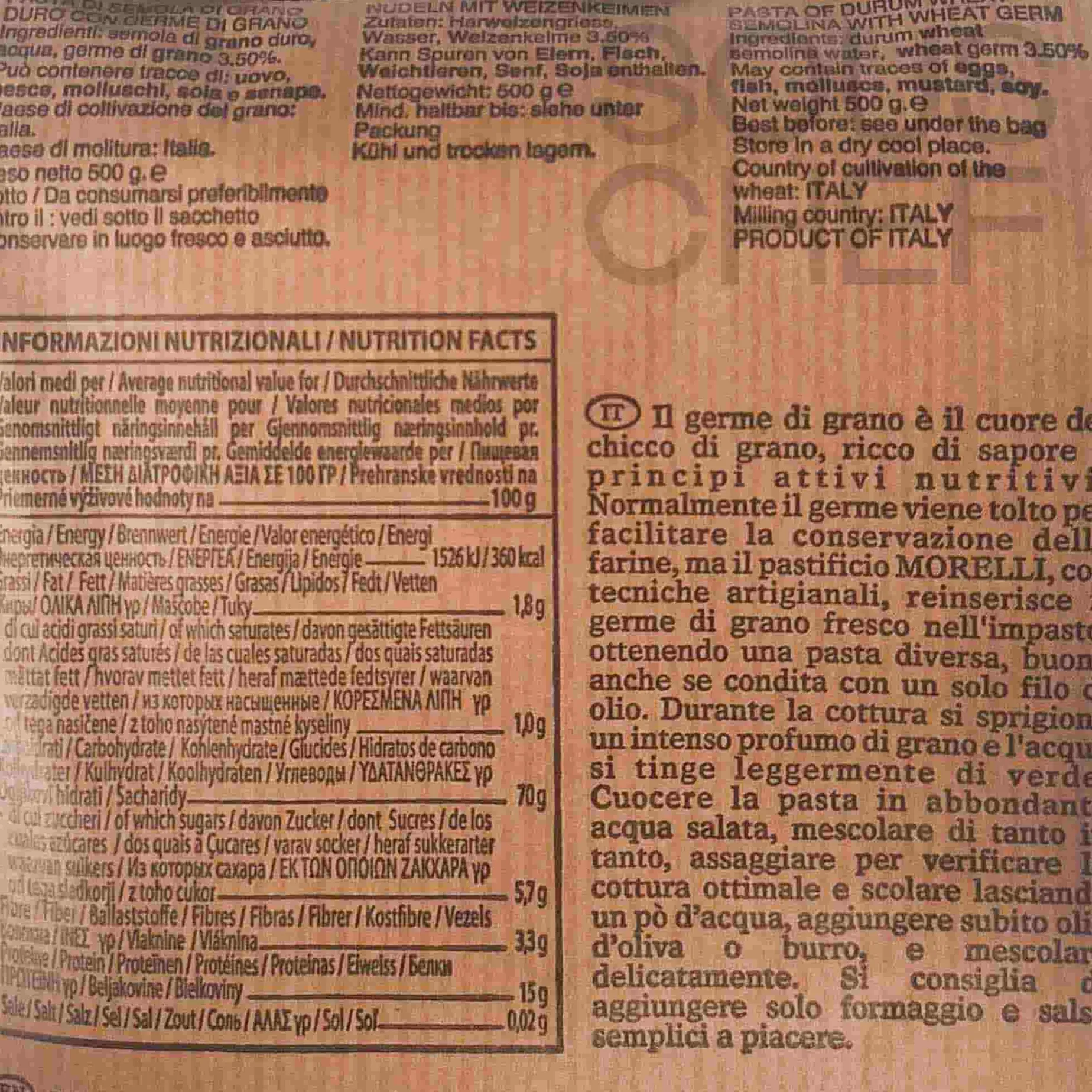 Morelli uses an artisan method of reincorporating wheat germ into semolina. It gives their pasta a unique flavour and aroma, similar to toasted wheat.