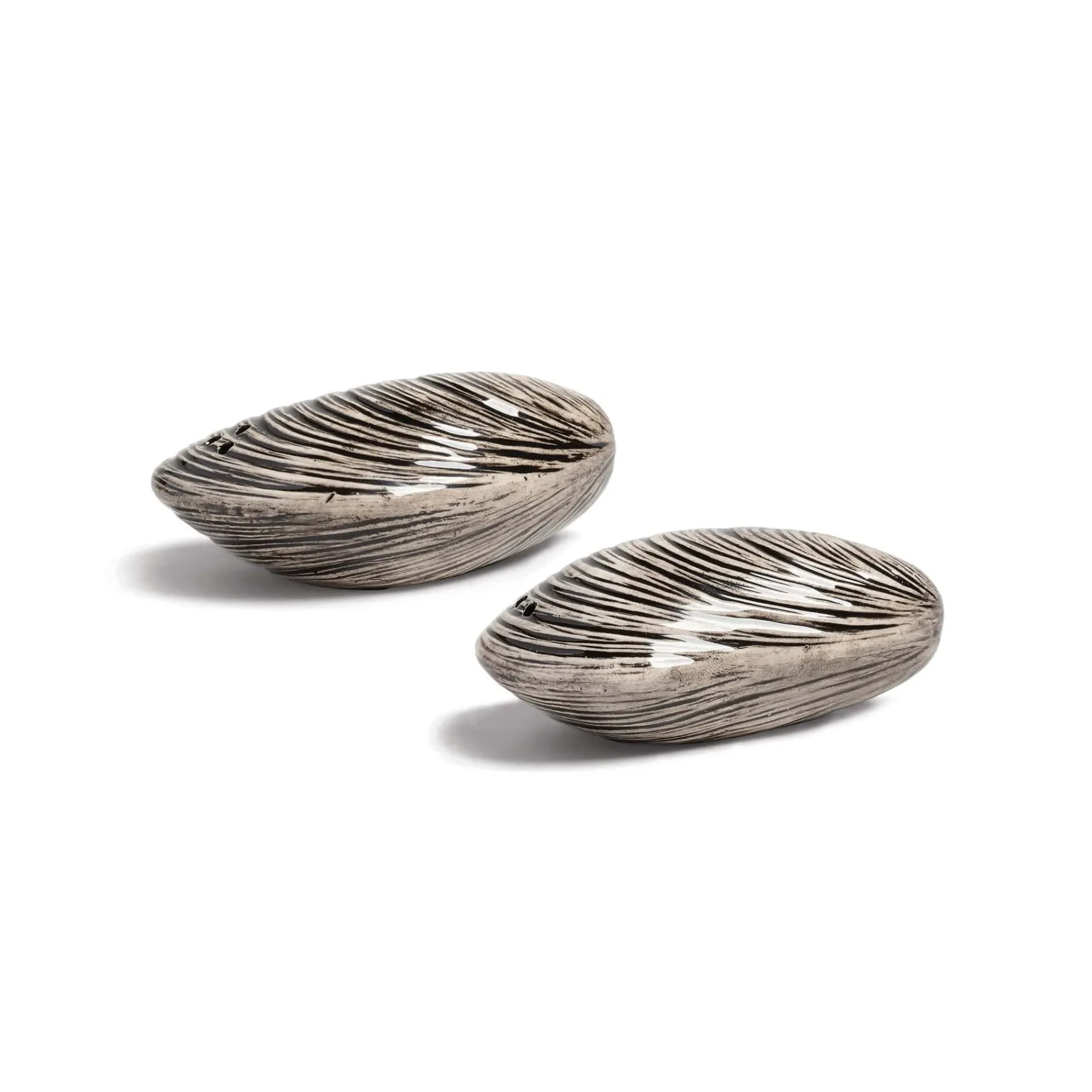 Hand-painted in earthy tones, the mussel shakers are very realistic. Use them to add salt and pepper to seafood salads and golden French fries.