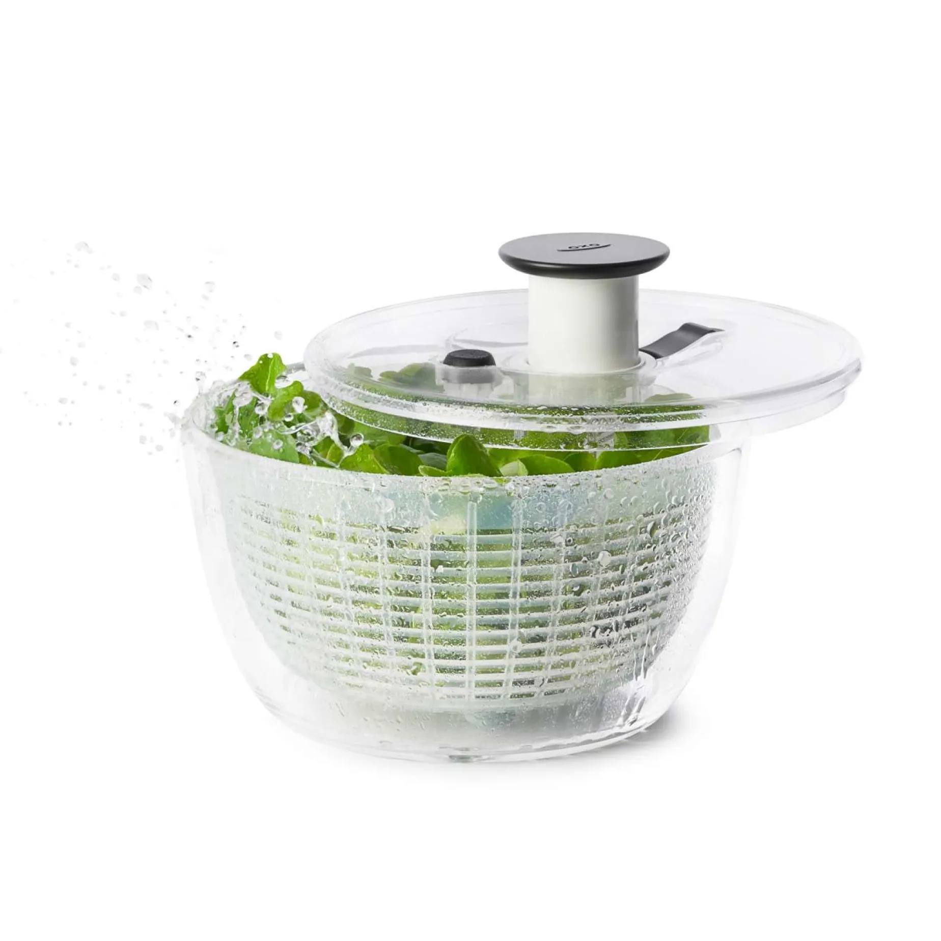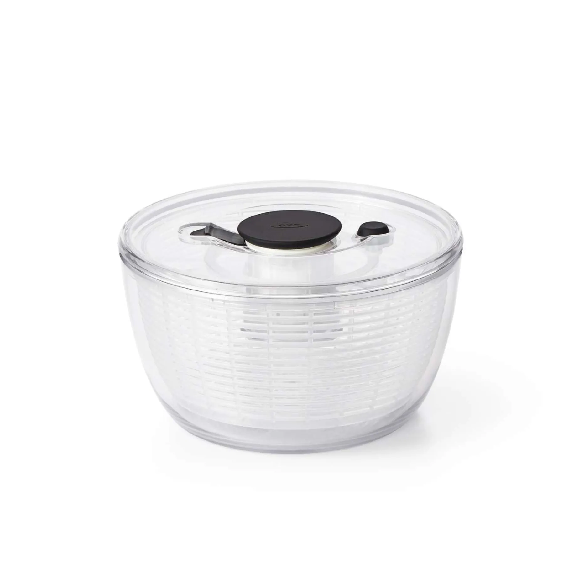 The OXO Good Grips little salad & herb spinner is the fast and easy way to dry herbs and salad leaves. Just a few presses on the plunger spins the central basket at high speed for fast salad prep. Press the ‘brake’ lever in the lid to stop the spinner completely before unloading.