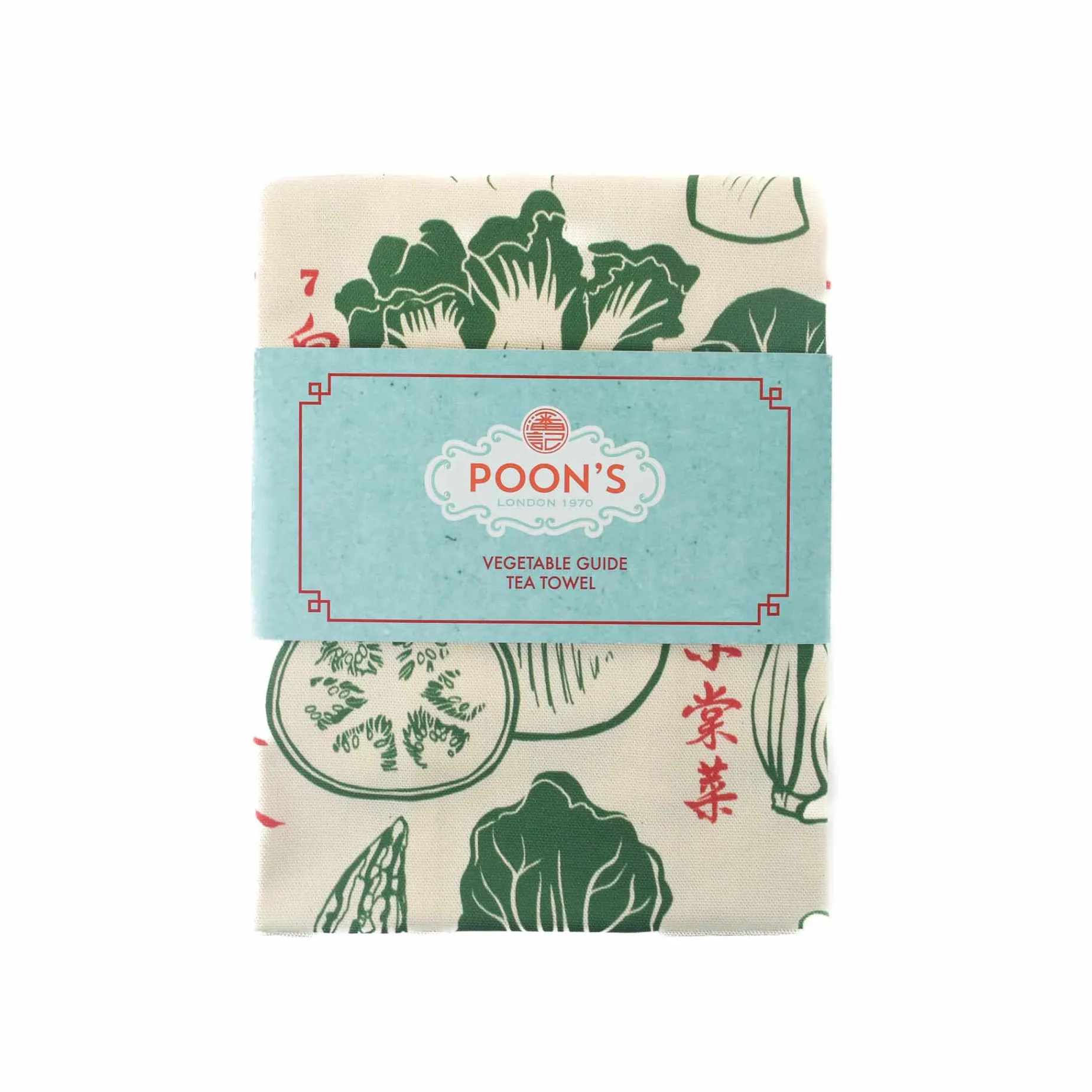 Poon’s vegetable guide tea towel will delight fans of Chinese food. The vibrant red and green design will brighten up any kitchen.