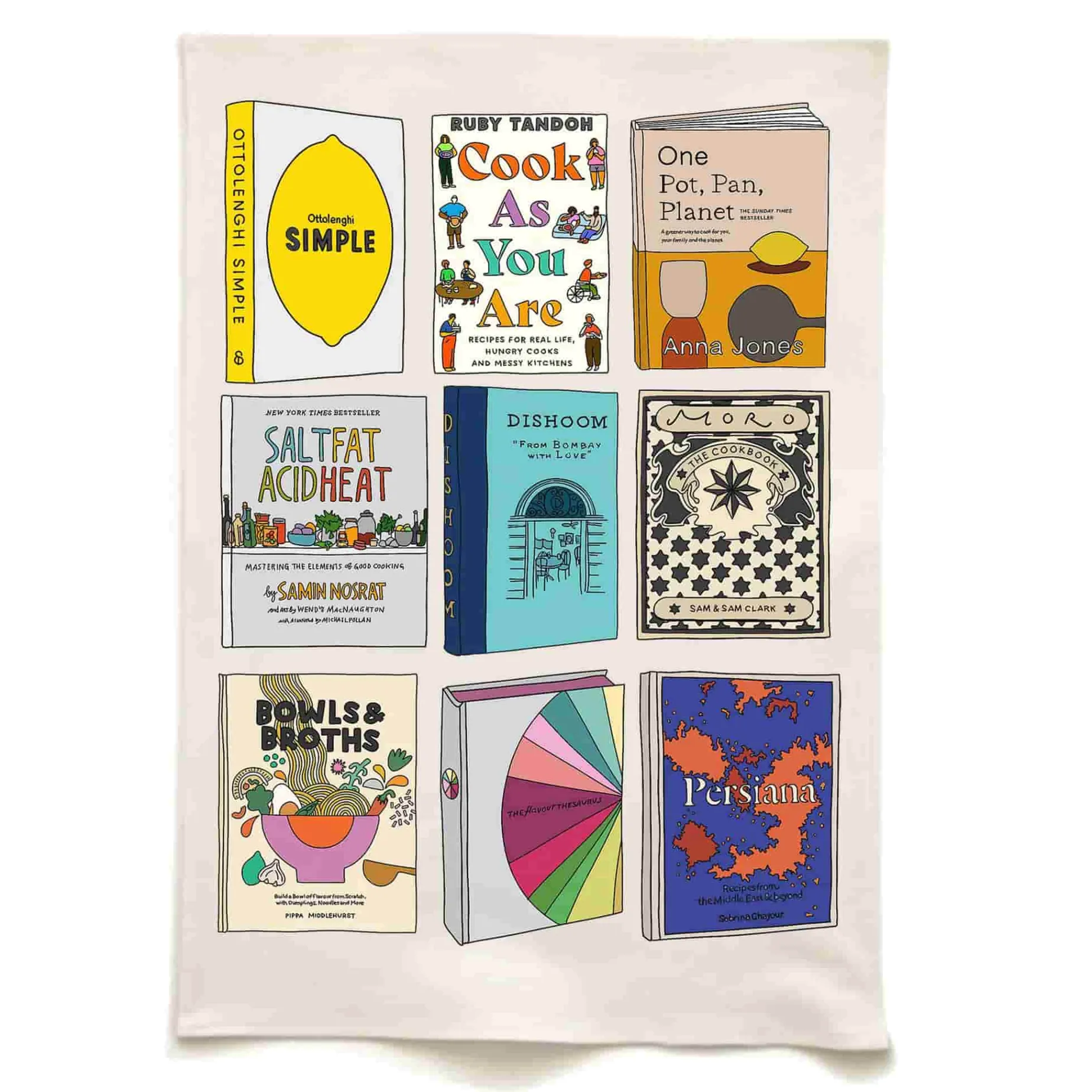 Ever get lost in a cookbook? This organic cotton tea towel is for you, or the cookbook lover in your life. From Dishoom to Persiana, this tea towel is decorated with the colourful illustrations of nine cookbook covers that everyone’s library should contain. Hand drawn and printed on organic cotton in the UK.