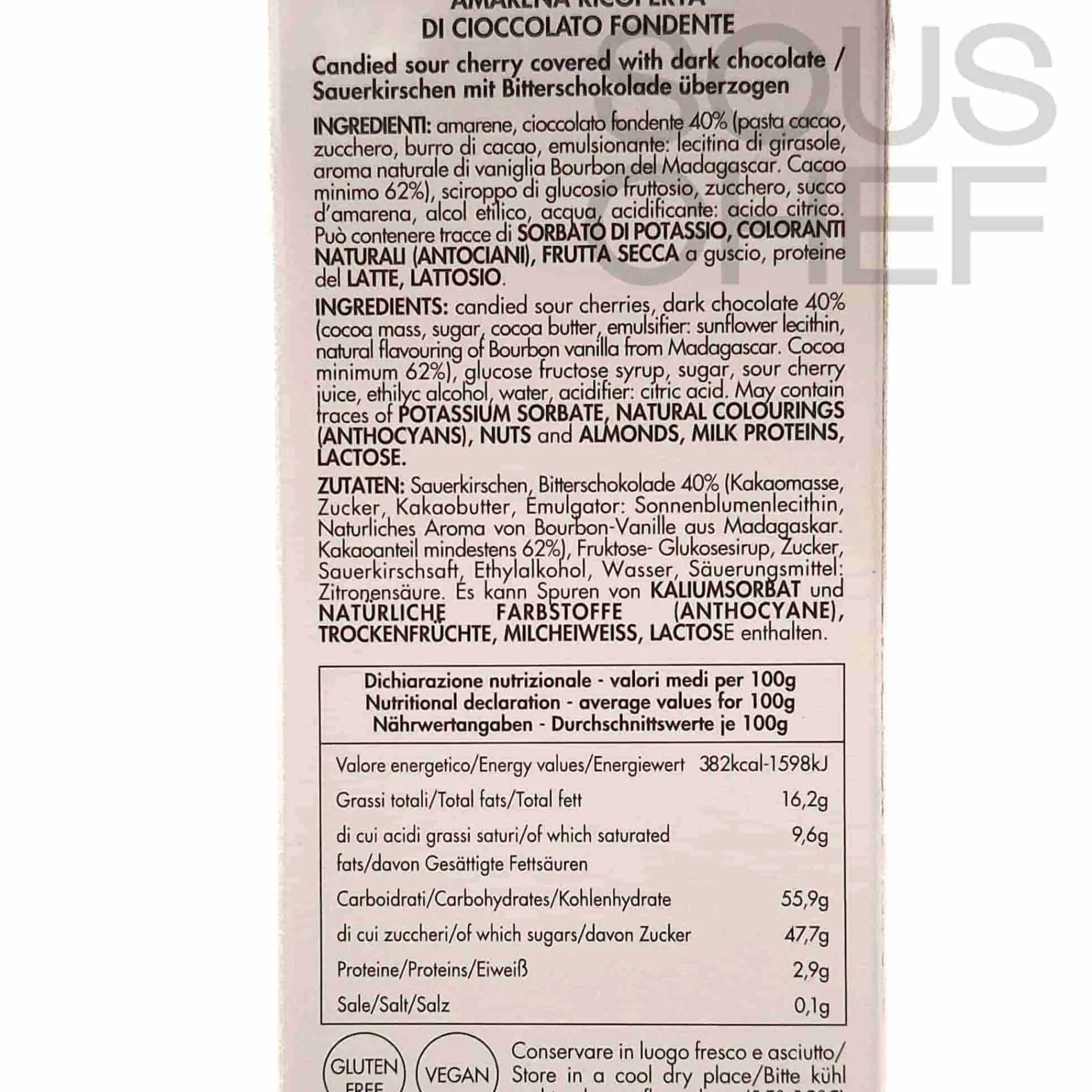 Product formulations and details may change. For the latest ingredients and allergen information always check product packaging prior to consumption. Ingredients: Candied sour cherries, 40% dark chocolate (cocoa mass, sugar, cocoa butter, emulsifier: sunflower lecithin, natural flavouring of bourbon vanilla from madagascar. Cocoa minimum 62%), glucose syrup, fructose, sugar, sour cherry juice, ethylic alcohol, water, acidifier: citric acid.