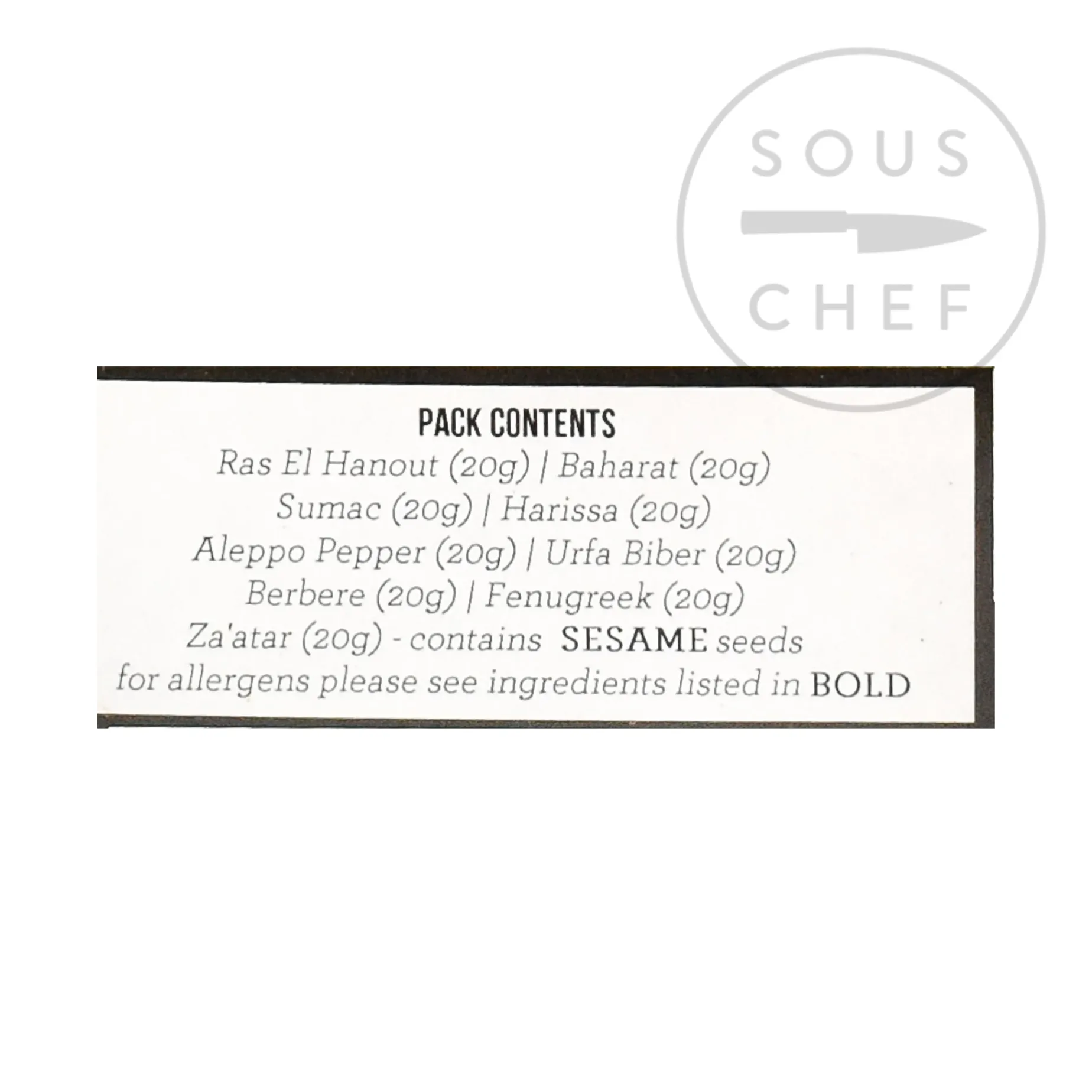 The Spice Kitchen African & Middle Eastern spice tin will send you on a culinary journey throughout Africa and the Middle East. This selection of essential spices and spice blends is presented in a stainless-steel spice tin, or masala dabba.