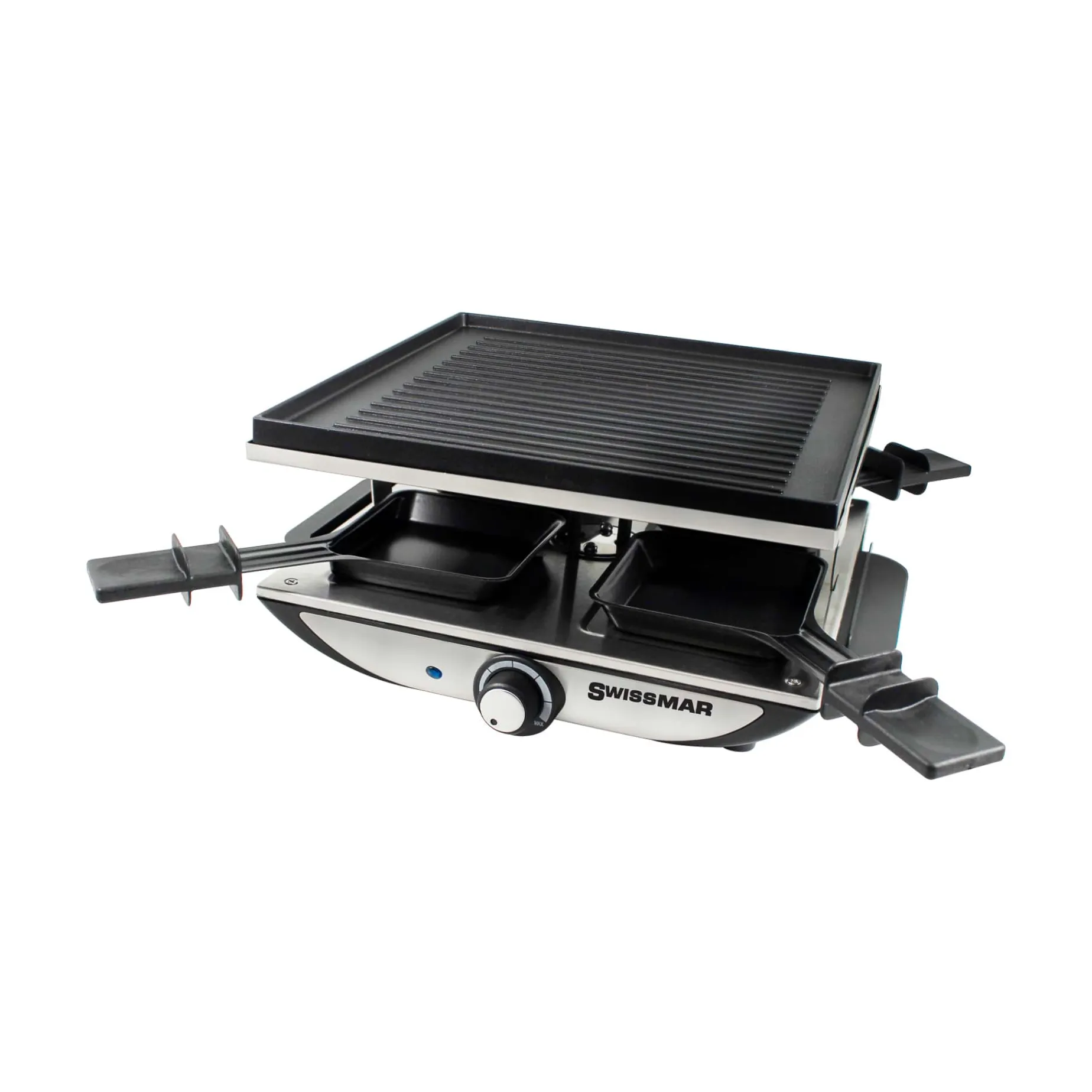 Enjoy raclette at home with the Swissmar Geneva raclette party grill. Suitable for up to four people, the set has everything you need for an evening of indulgence. Most cheese shops sell Swiss raclette, but you can use any cheese that melts easily.
