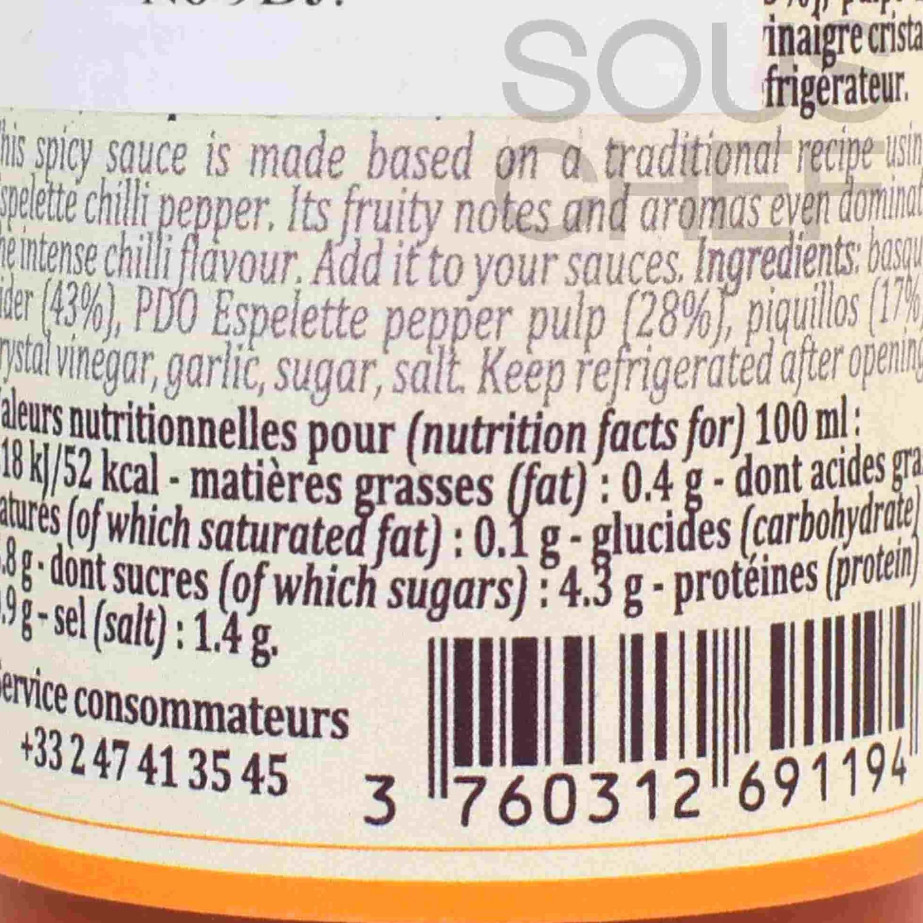 Product formulations and details may change. For the latest ingredients and allergen information always check product packaging prior to consumption. Ingredients: Basque cider (43%), pdo spelette pepper pulp (28%), piquillos (17%), crystal vinegar, garlic, sugar, salt.