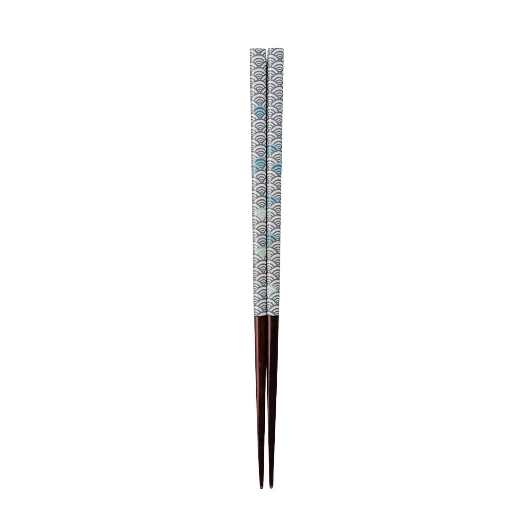 The ends of the chopsticks are covered in washi, which is decorative Japanese paper featuring traditional motifs and designs. Seigaiha is a pattern of layered concentric circles that resemble ocean waves. It dates back to the 6th century and symbolises surges of good luck.