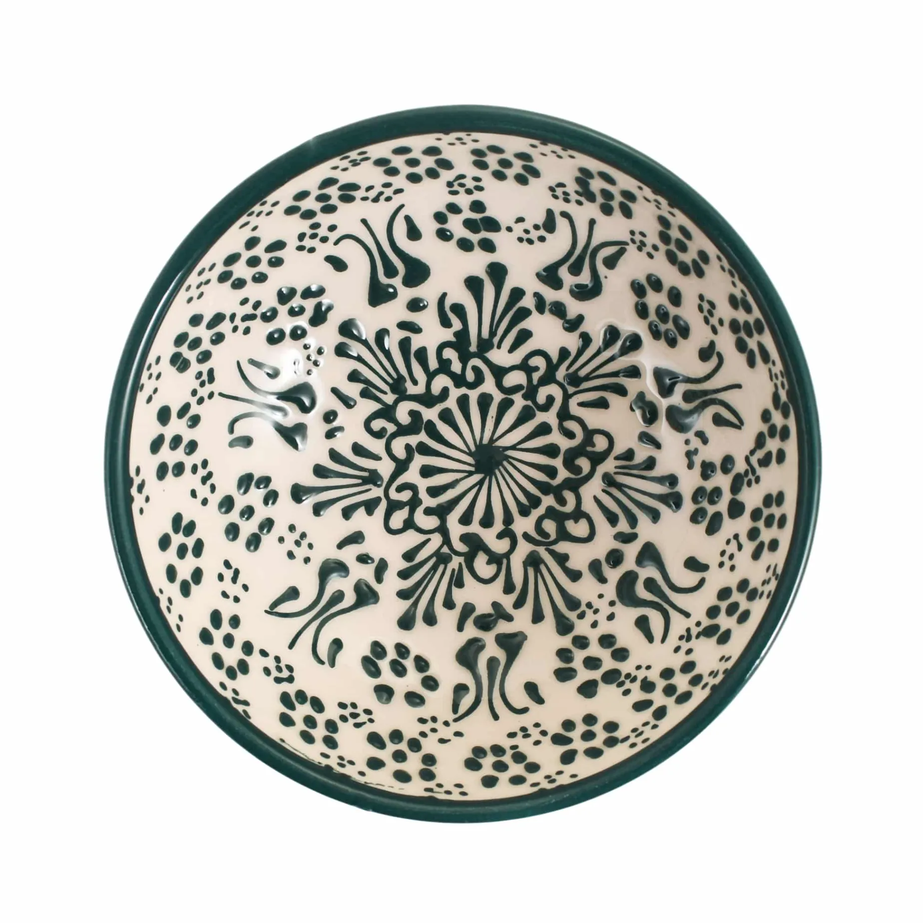 This green patterned cereal bowl will add Turkish style to your breakfast table. It features an intricate green design on a white background.