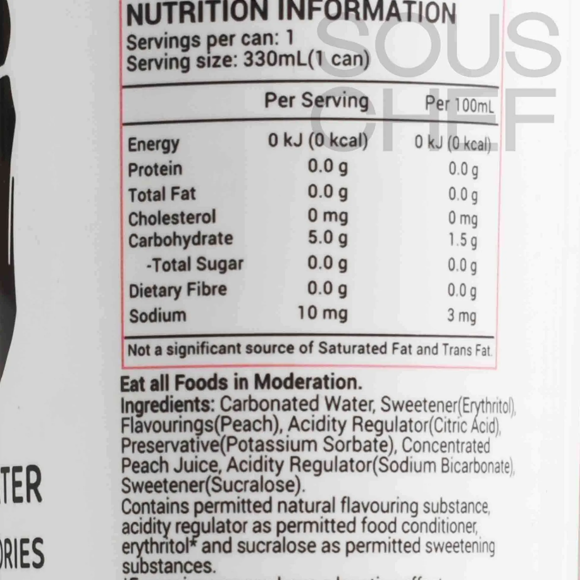 Product formulations and details may change. For the latest ingredients and allergen information always check product packaging prior to consumption. Ingredients: Carbonated water, sweetener (erythiritol), flavourings (each), acidity regulator (cirtic acid), preservative (potassium sorbate), concentrated peach juice, acidity regulator (sodium bicarbonate), sweetener (sucralose).