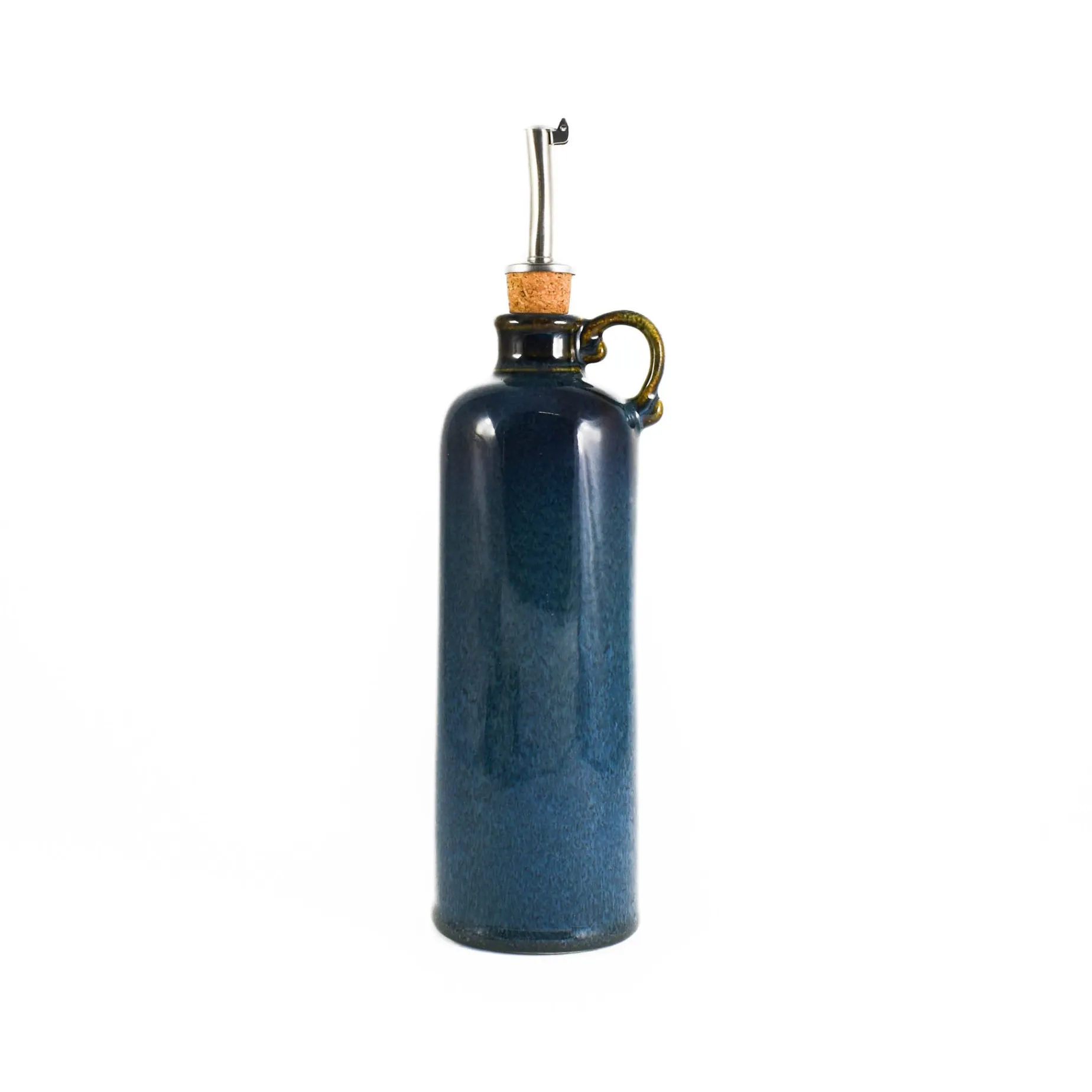 This blue glaze pouring bottle is an elegant and striking way to drizzle olive oil and vinegar over dishes. Perfect for pouring olive oil into the pan or drizzling aged balsamic on salad at the table. It includes a cork stopper and spout, to use as storage as well. This is a practical and beautiful piece that looks beautiful on any kitchen counter.