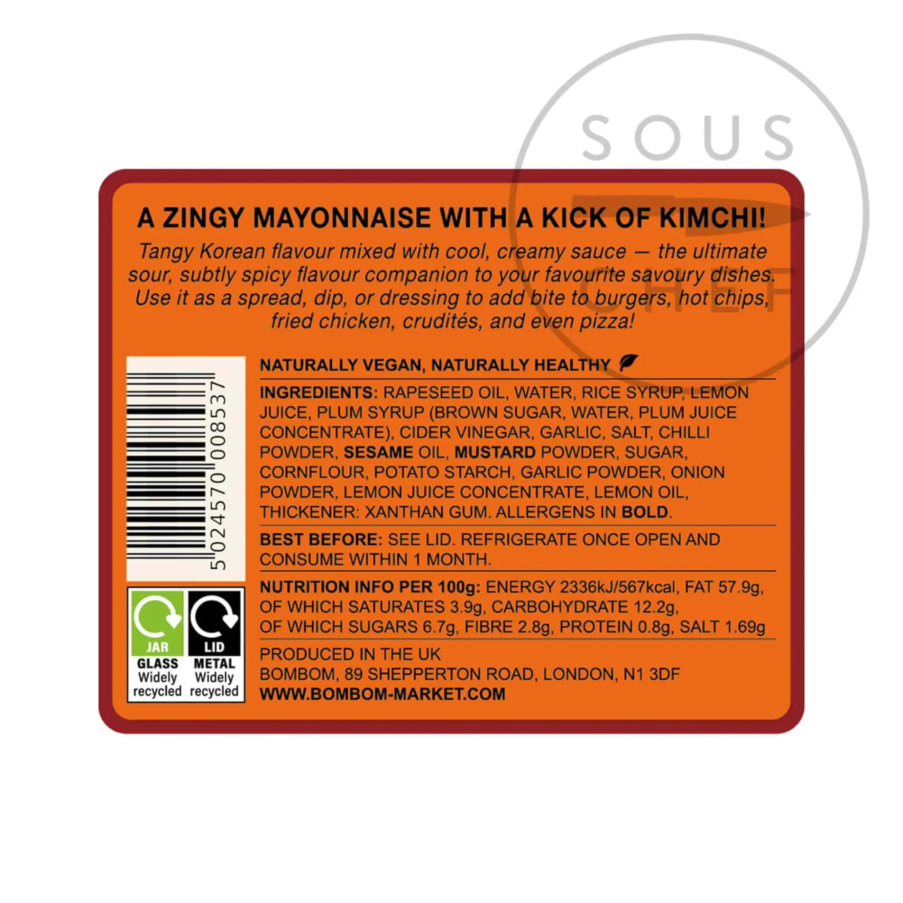 BomBom Market’s vegan kimchi mayonnaise is the dream condiment for any lover of this hot-sour Korean pickle. This creamy mayonnaise is full of zingy flavour from the fermented kimchi and gently warm with a subtle chilli heat – a moreish twist on the classic condiment.