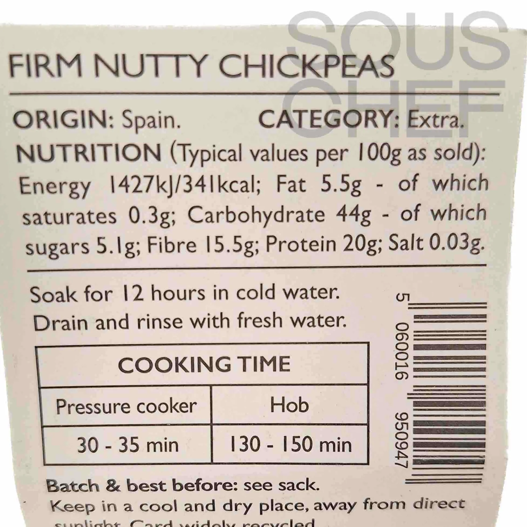 To cook the chickpeas, soak them in cold water for 12 hours. Drain and rinse with fresh water. They will cook in 130-150 minutes on the hob or 30-35 minutes in a pressure cooker.