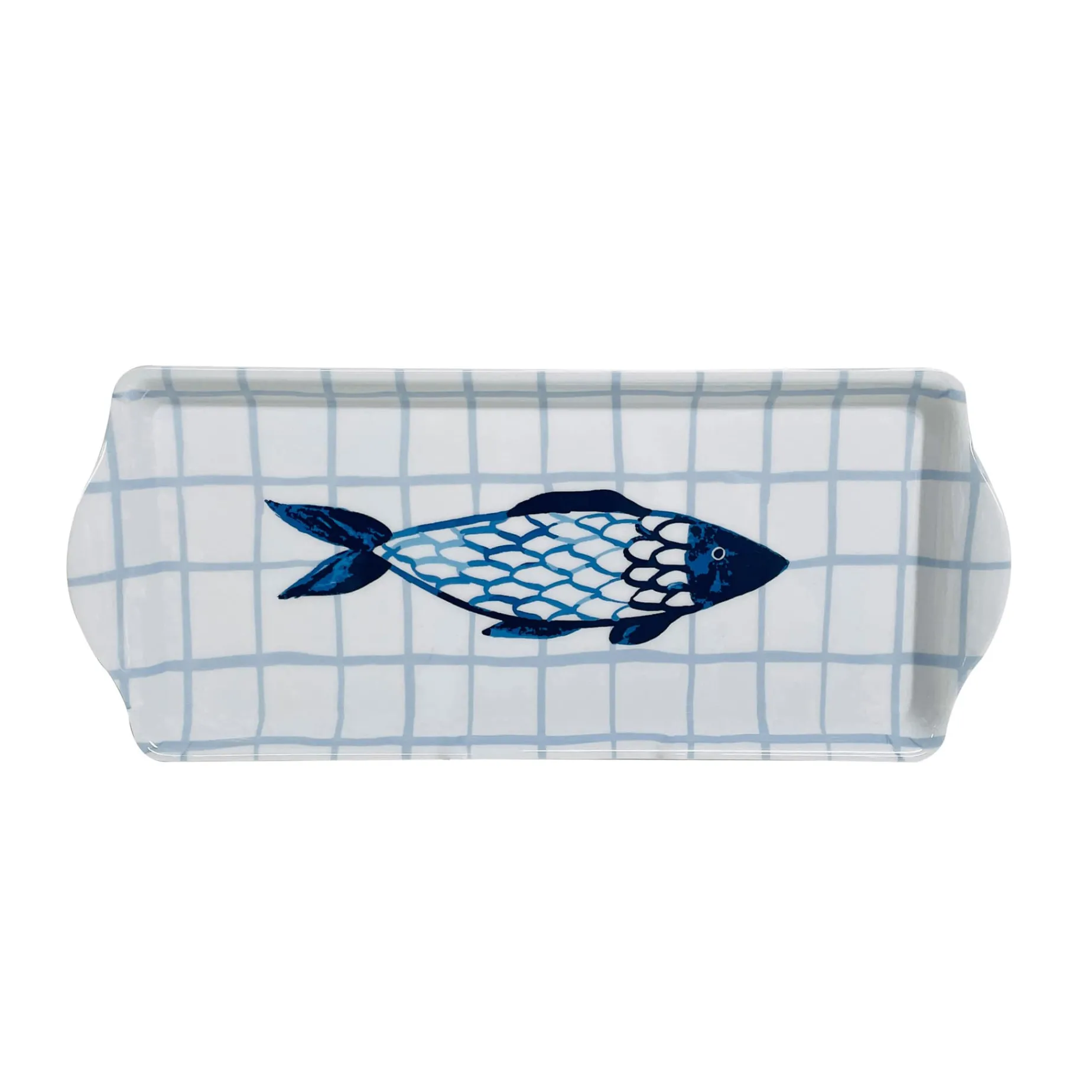 The tray features a hand-painted watercolour design. A stylised, dark blue fish swims against the white and pale blue background. Fill the tray with seafood canapés or biscuits to dunk in your tea.