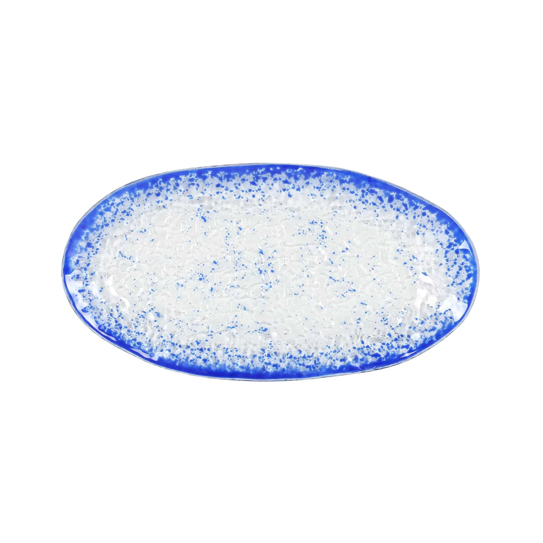 This glass serving tray has a cobalt blue rim and pale blue splatter effect. It’s modern and eye-catching, adding colour and personality to your table.