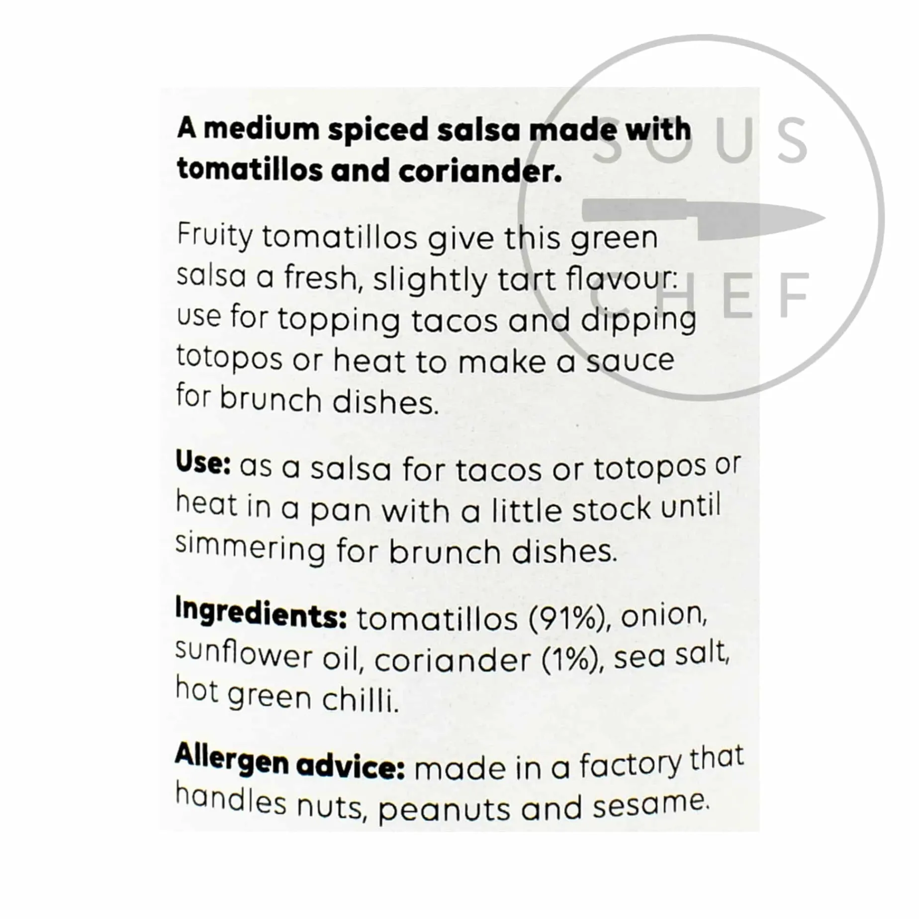 Product formulations and details may change. For the latest ingredients and allergen information always check product packaging prior to consumption. Ingredients: tomatillos (91%), onion, sunflower oil, coriander (1%), sea salt, hot green chilli.