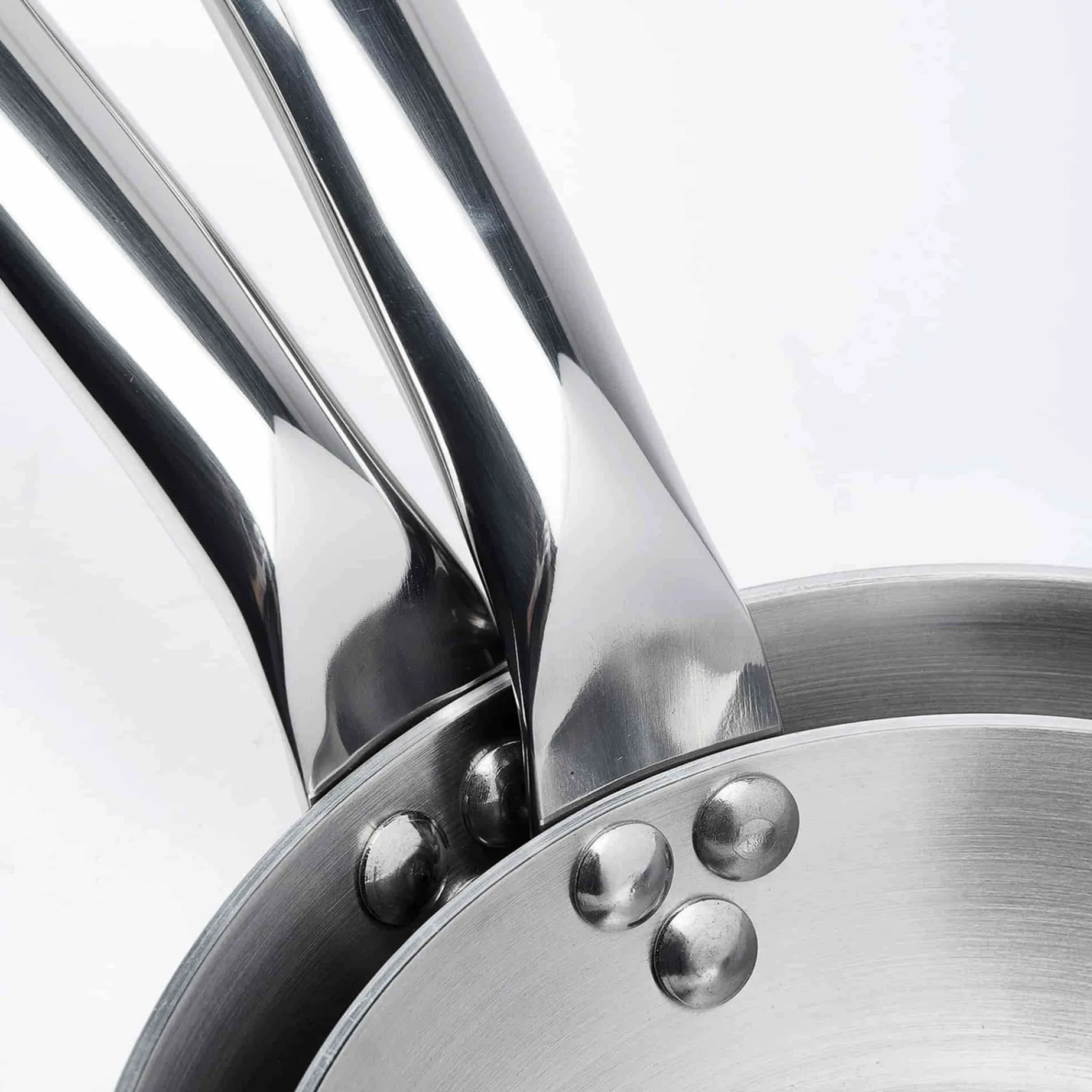 Two layers of stainless steel sandwich an aluminium core, giving you the aesthetics of a traditional pan combined with extraordinary heat control. The pans are reactive and reliable, whether you’re searing meat or toasting a grilled cheese sandwich. Plus, the great conductivity means your pan uses less energy as it heats up.