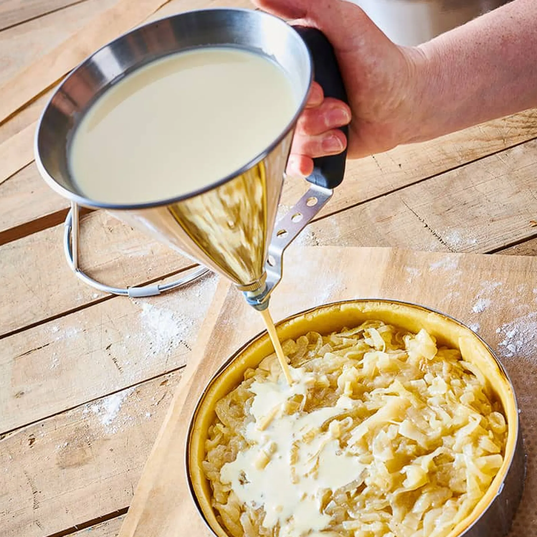 Pour the cake batter into the funnel, then press the trigger on the handle to release a stream of batter into a mould or tray. The flow stops as soon as you release the trigger for precise control and fewer drips.