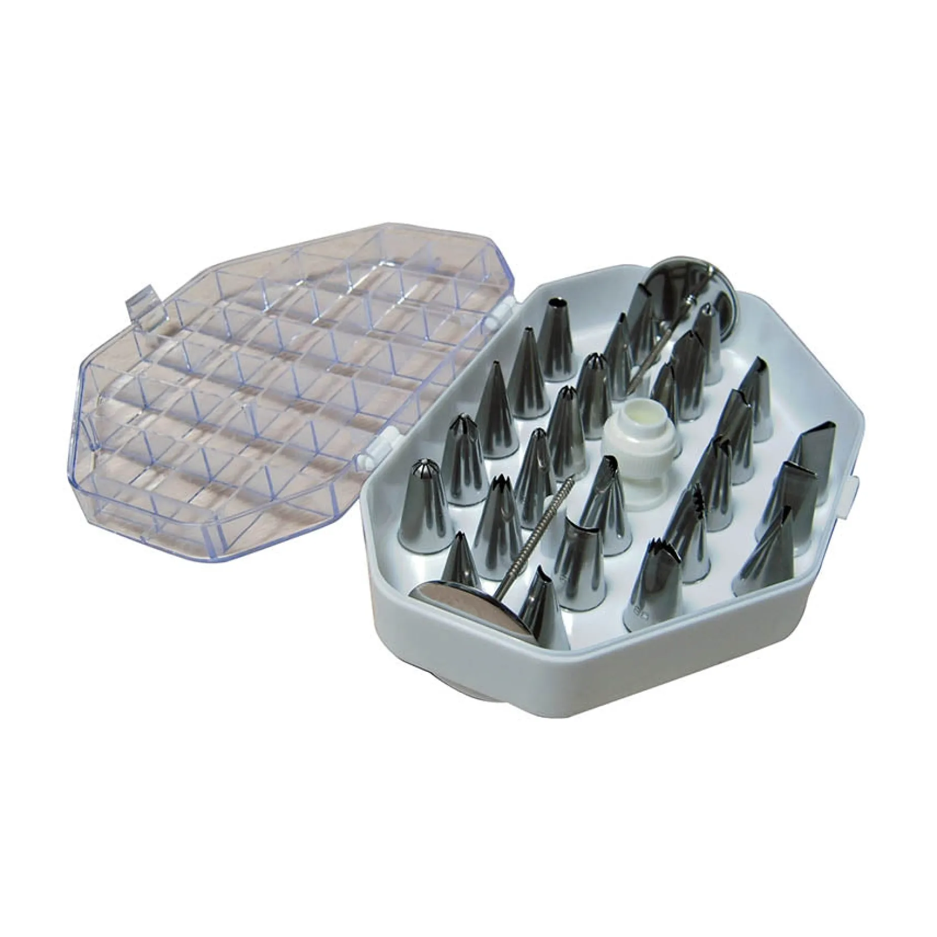 A set of stainless steel professional piping nozzles for larger decorations, filling and icing is also available.