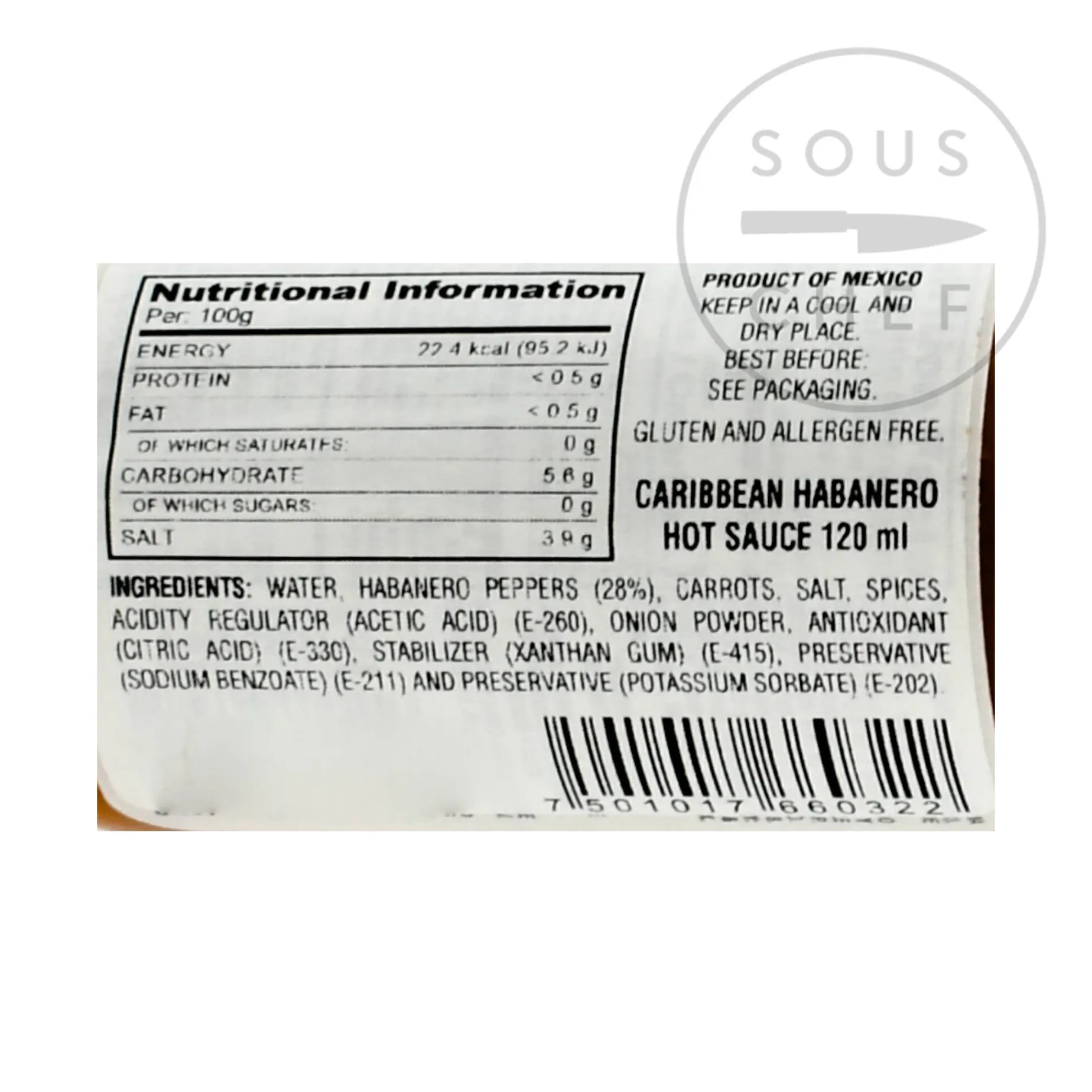 Product formulations and details may change. For the latest ingredients and allergen information always check product packaging prior to consumption. Ingredients: water, habanero peppers (28%), carrots, salt, spices, acetic acid E260, onion powder, citric acid E330, xanthan gum E415, sodium benzoate E211, potassium sorbate E202.