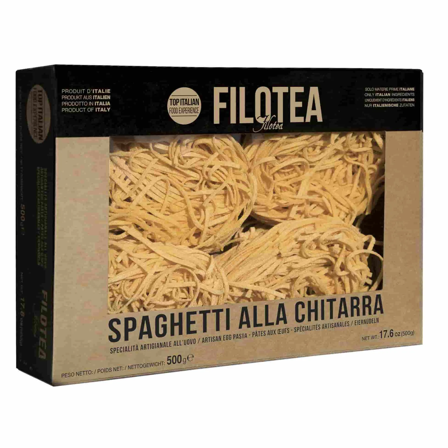 The dried pasta is presented in nests in Filotea’s iconic black and brown boxes.