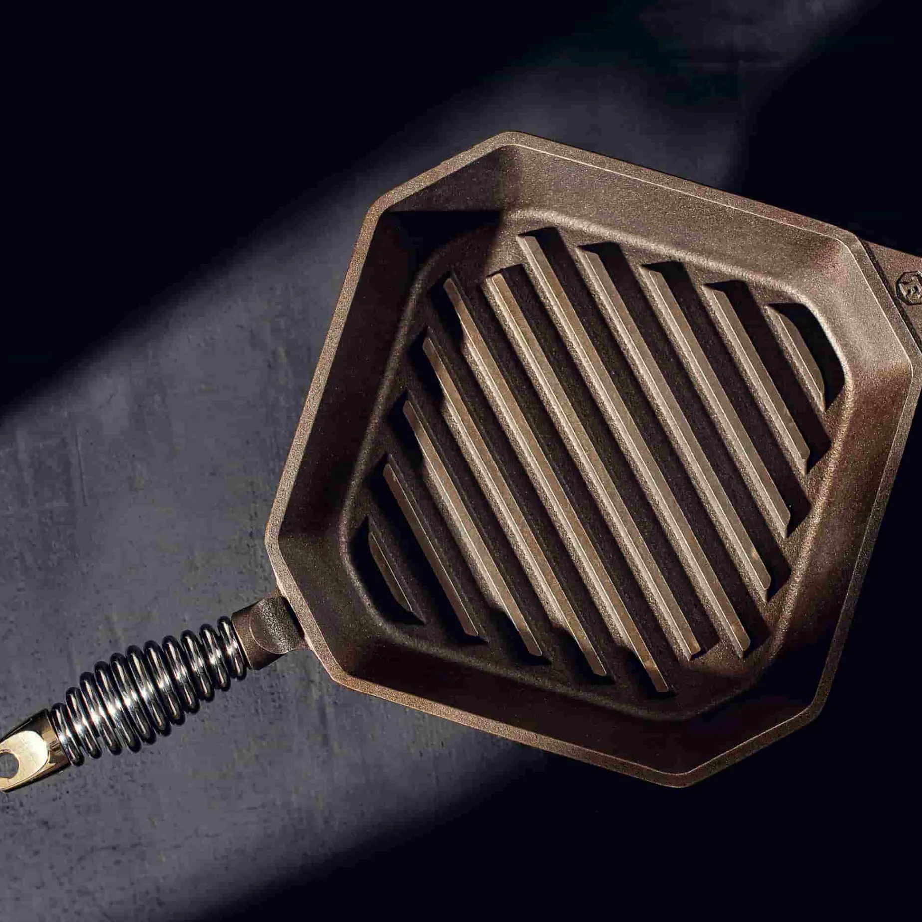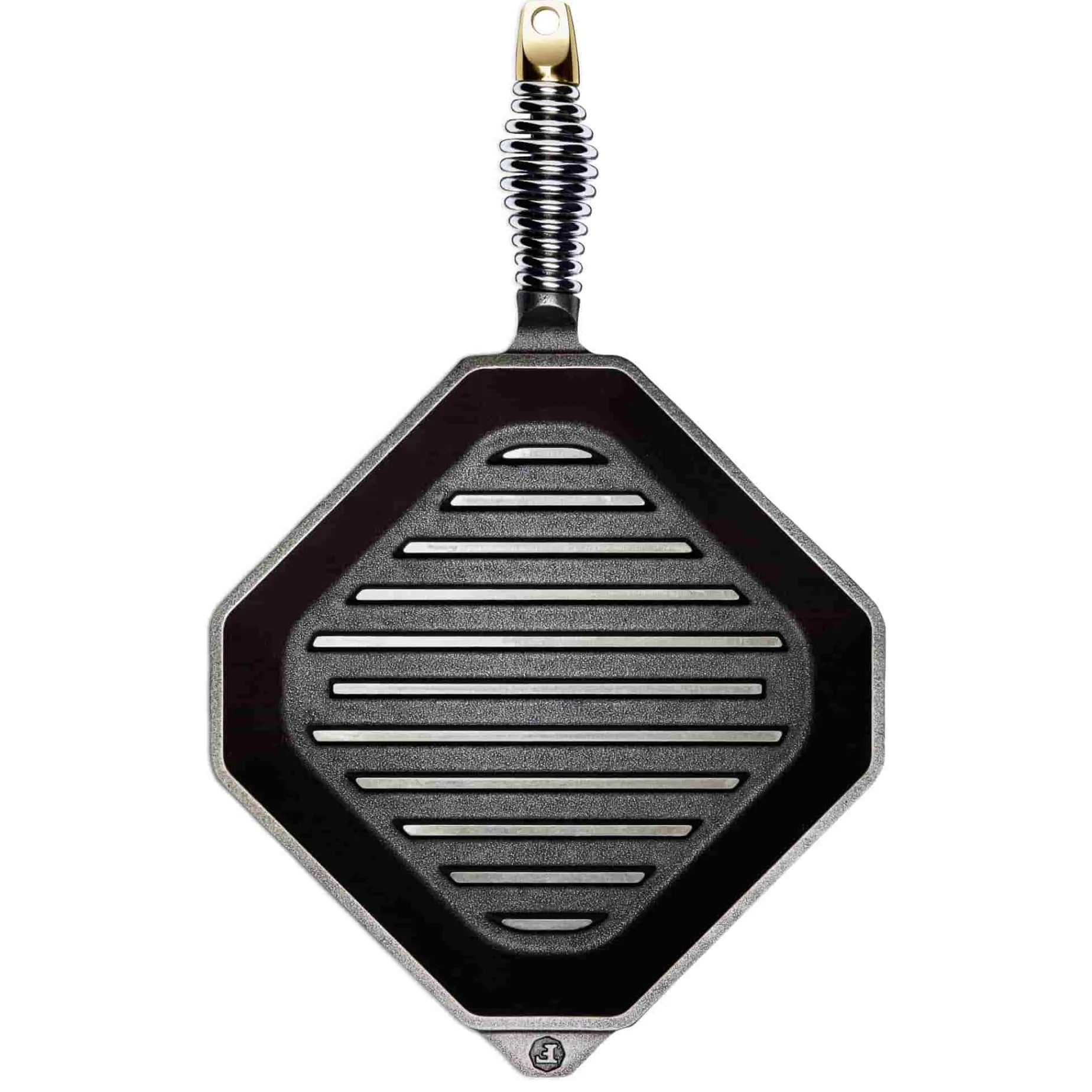 The pan features a unique diamond shape that makes it easy to pour away excess fat and juices. It also has a coiled stainless steel handle that stays cool while you grill so you can easily move it from your stove to a heat resistant mat on your countertop.