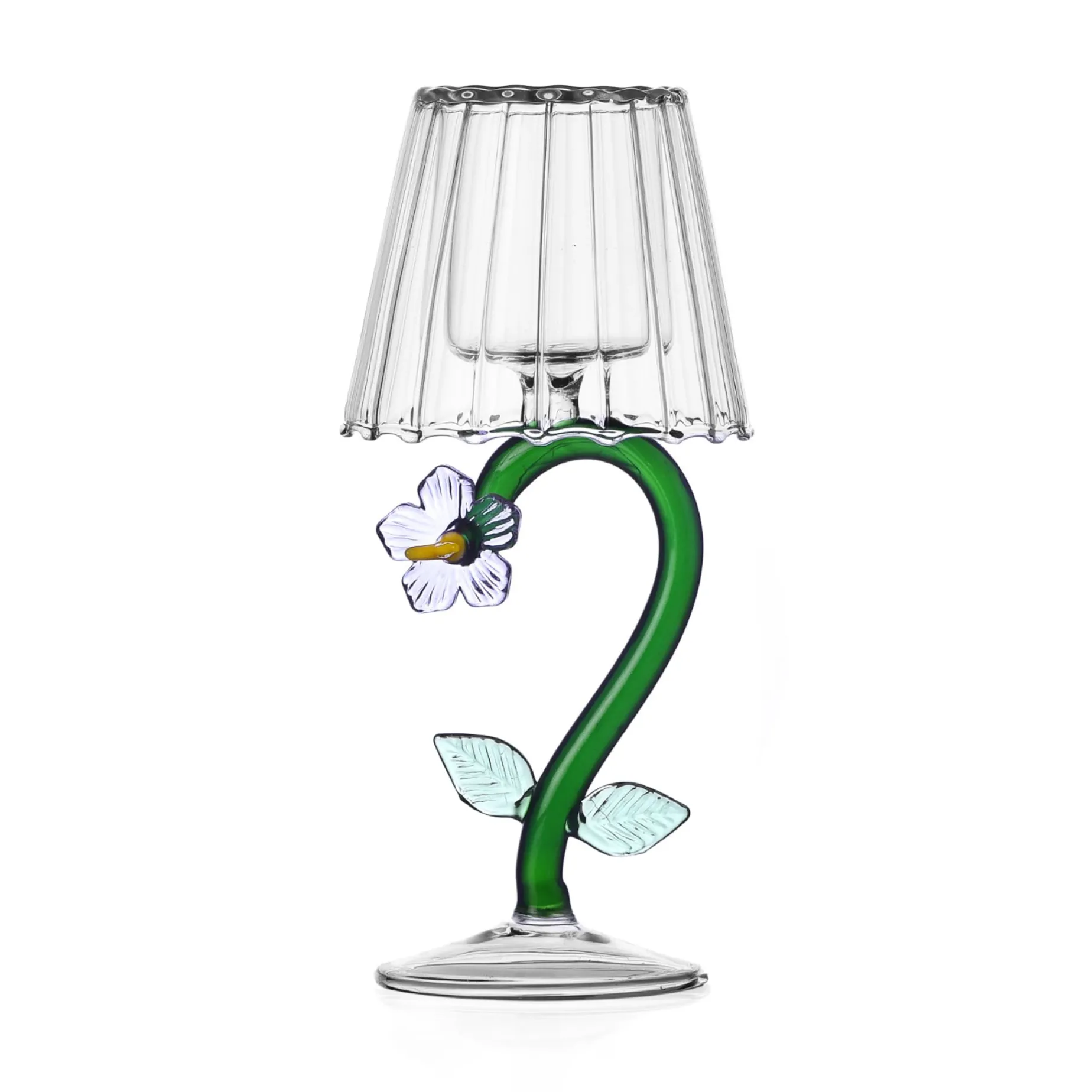 The tealight holder is made from flame-worked glass. It features a delicate green stem with glass leaves and a lilac flower. Place it on a mantelpiece or on the table for a romantic meal.