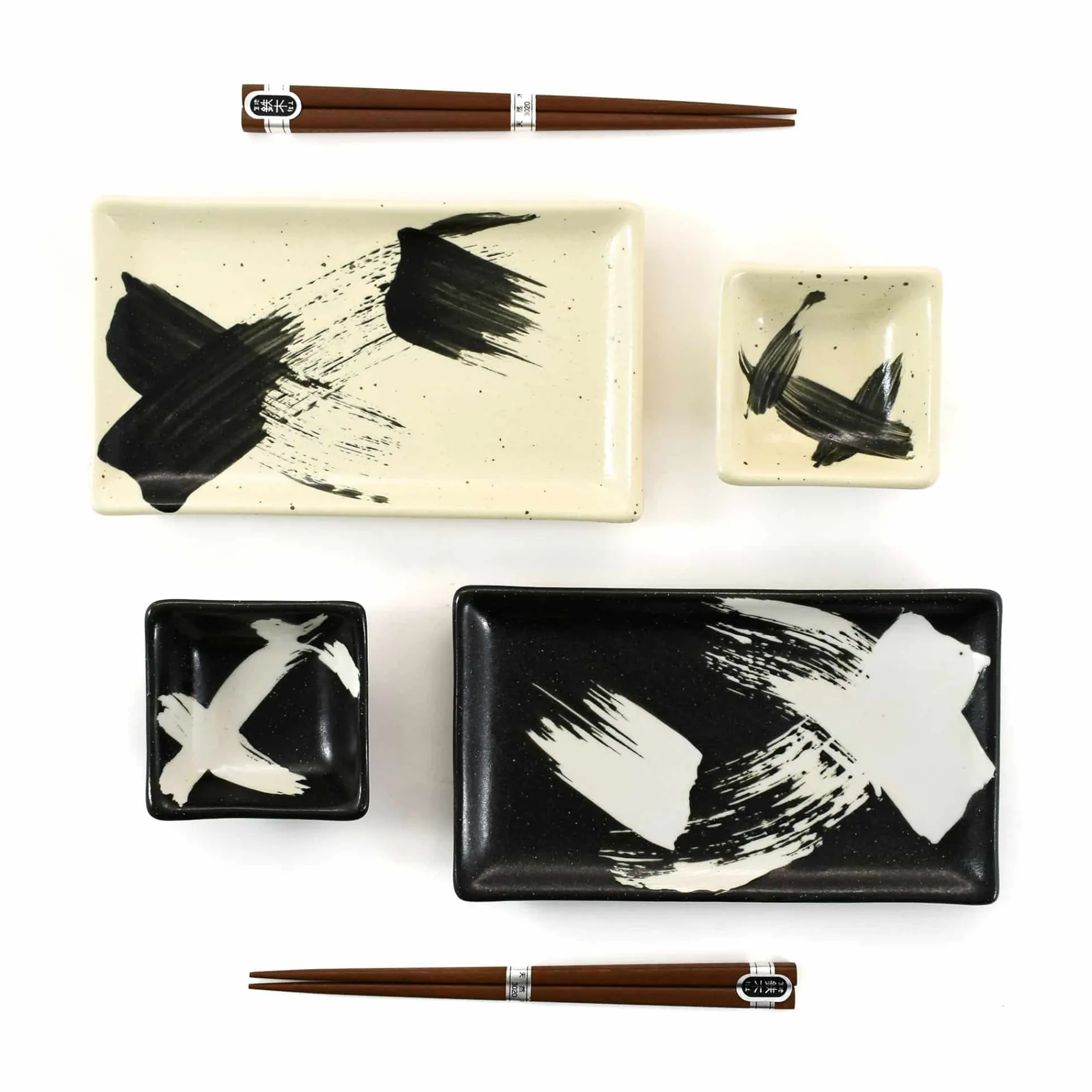 Decorated black and white with contrasting brush strokes on each piece of crockery, this beautiful set makes a great sushi and sashimi serving platter. Pour ponzu sauce into the small bowls for dipping.