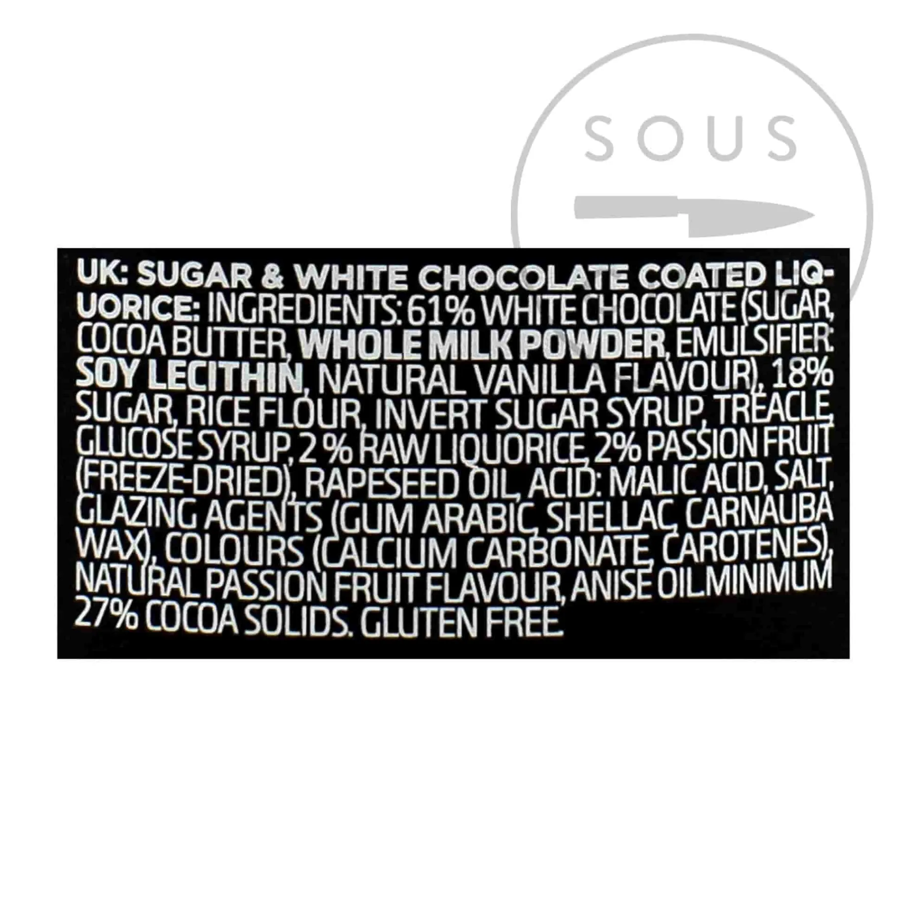 Product formulations and details may change. For the latest ingredients and allergen information always check product packaging prior to consumption. Ingredients: 61% white chocolate (sugar, cocoa butter, whole milk powder, emulsifier: soy lecithin, natural vanilla flavour), 18% sugar, rice flour, invert sugar syrup, treacle, glucose syrup, 2% raw liquorice, 2% passion fruit (freeze-dried), rapeseed oil, acid: malic acid, salt, glazing agent (gum arabic, shellac, carnauba wax), colours (calcium carbonate, carotenes), natural passion fruit flavour, anise oil. Minimum 27% cocoa solids. Gluten free.