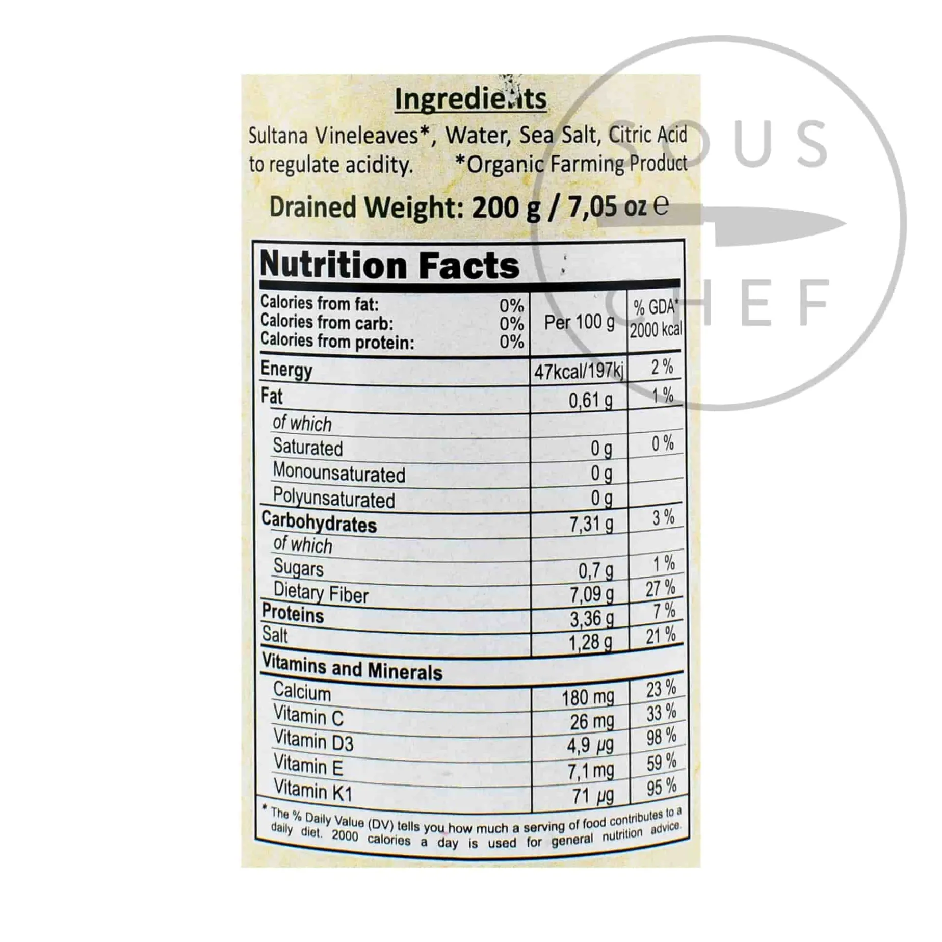Product formulations and details may change. For the latest ingredients and allergen information always check product packaging prior to consumption. Ingredients: Vine Leaves (60 Pieces), water, salt, citric acid