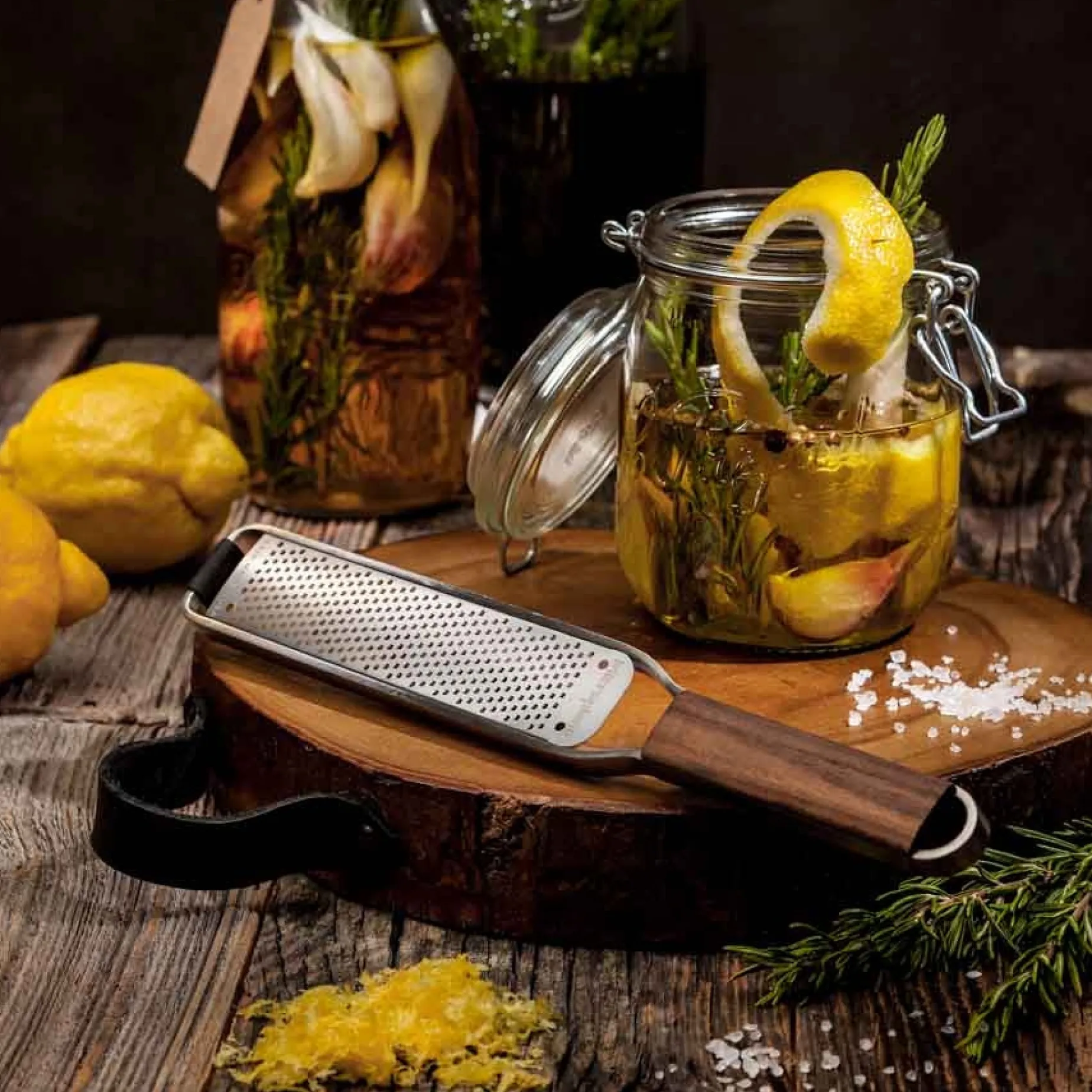 The walnut Microplane zester makes it effortless to zest limes, lemons and oranges. The ultra-sharp blades glide through the zest without cutting through to the pith underneath.