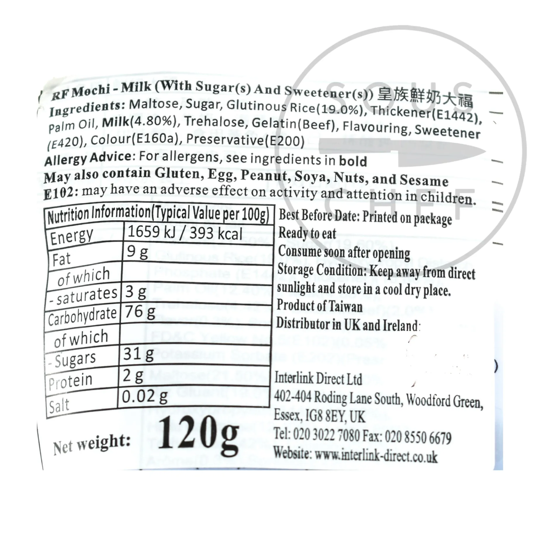 Product formulations and details may change. For the latest ingredients and allergen information always check product packaging prior to consumption. Ingredients: Maltose, sugar, glutinous rice (19%), thickener (E1442), palm oil, milk (4.8%), trehalose, gelatin (beef), flavouring, sweetener (E420), colour (E160a), preservative (E200)