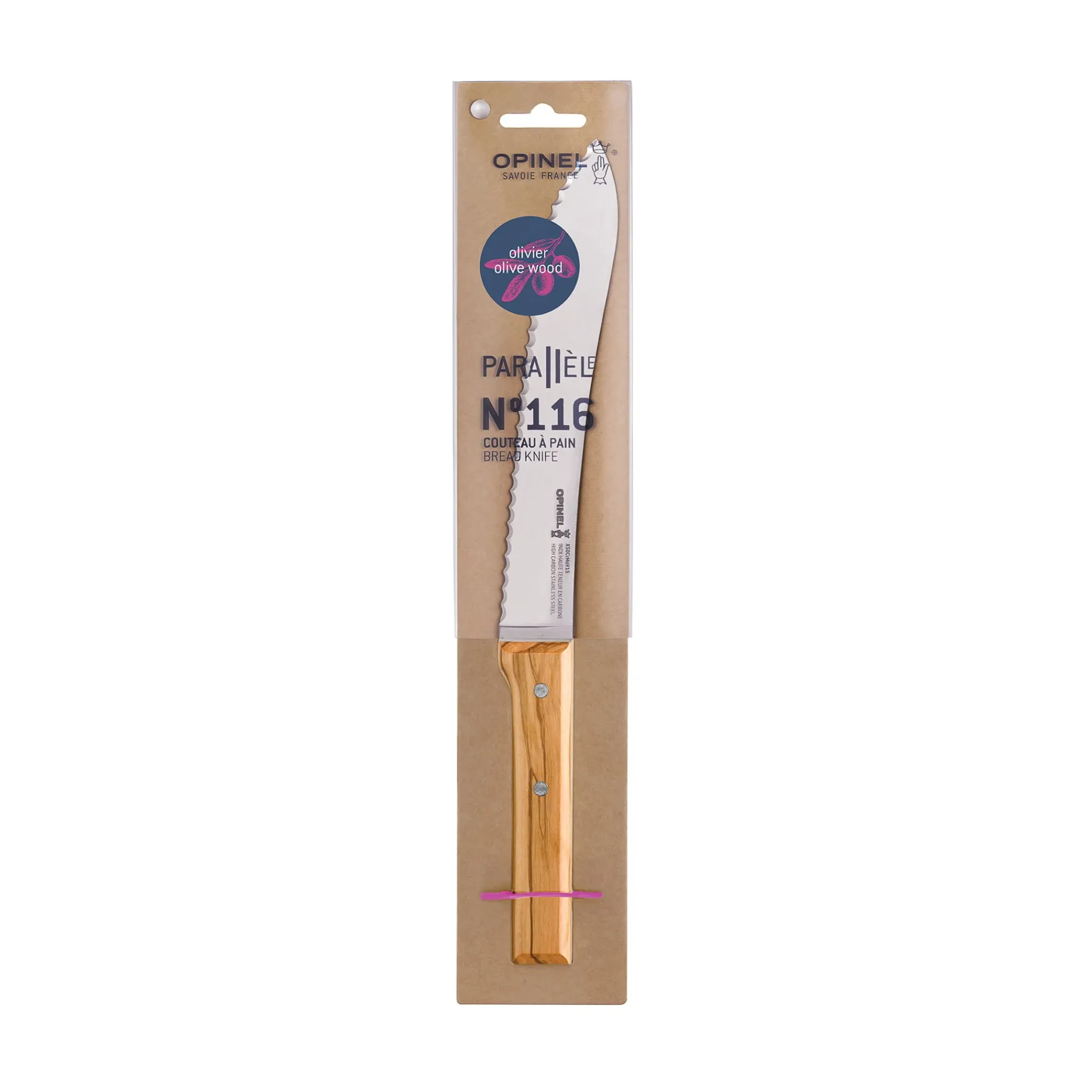 This Opinel Parallele bread knife has a beautiful olive wood handle. We love its warm colour and beautiful natural grain pattern.