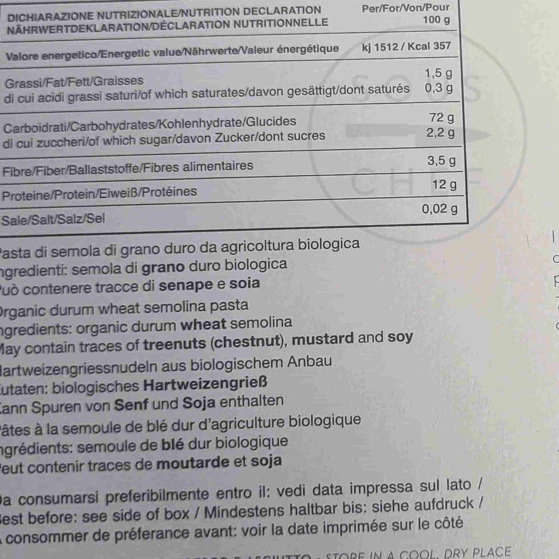 Product formulations and details may change. For the latest ingredients and allergen information always check product packaging prior to consumption. Ingredients: Organic durum wheat semolina 100%