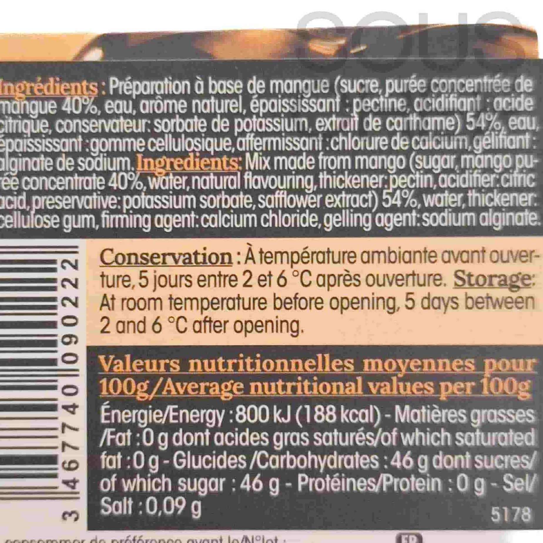 Product formulations and details may change. For the latest ingredients and allergen information always check product packaging prior to consumption. Ingredients: mix made from mango (sugar, mango puree concentrate 40%, water, natural flavouring, thickener: pectin, acidifying agent: citric acid, preservative: potassium sorbate, safflower extract) (EU) 54%, water, thickener: cellulose gum; firming agents: calcium chloride and gelling agent: sodium alginate.